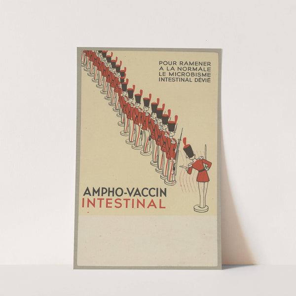 This print features a striking illustration from the artwork "Ampho-vaccin Intestinal" by A.D. Ronchèse, created in 1910-1950. The image depicts a long line of identical figures standing in perfect formation, each wearing tall black hats and red jackets with white...