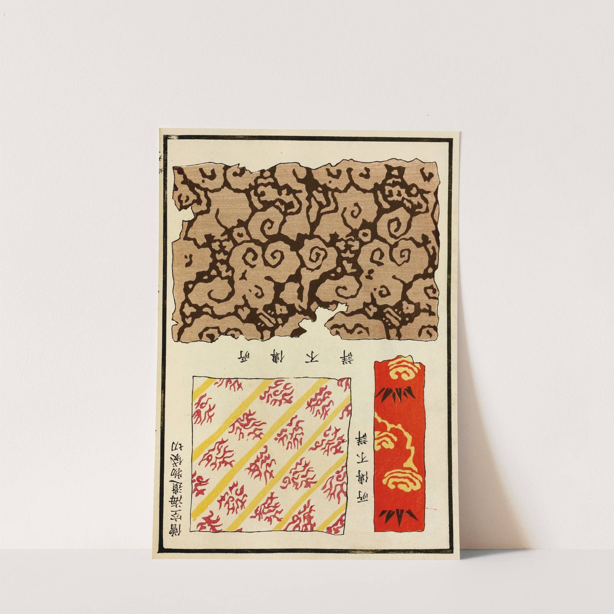 This art print features a traditional Chinese design divided into three distinct sections. The top section showcases an intricate pattern of swirling brown lines against a beige background, reminiscent of classical Chinese calligraphy or ornamental border designs. Below, the second...