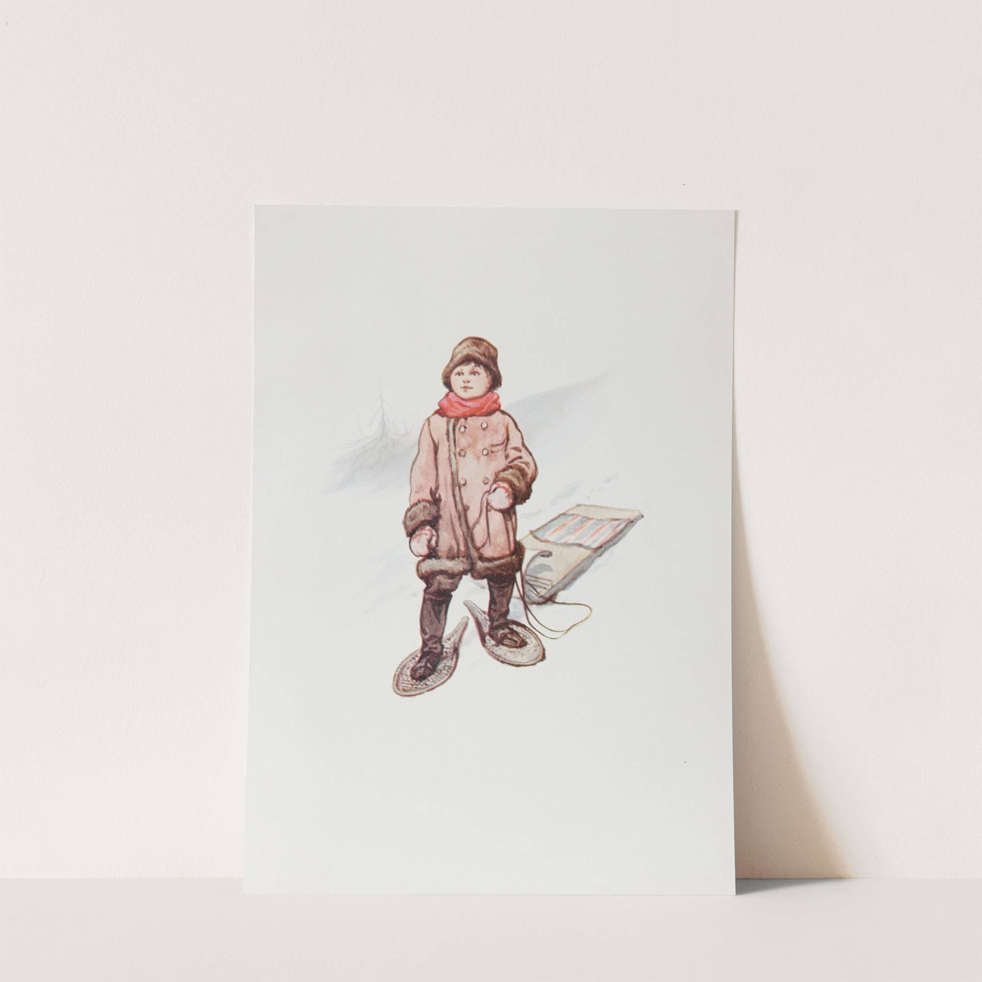 This striking digital illustration captures a young person standing confidently in winter attire. The artwork features soft yet bold lines, with a color palette dominated by cool tones of browns, reds, and whites. The figure is dressed warmly in a...