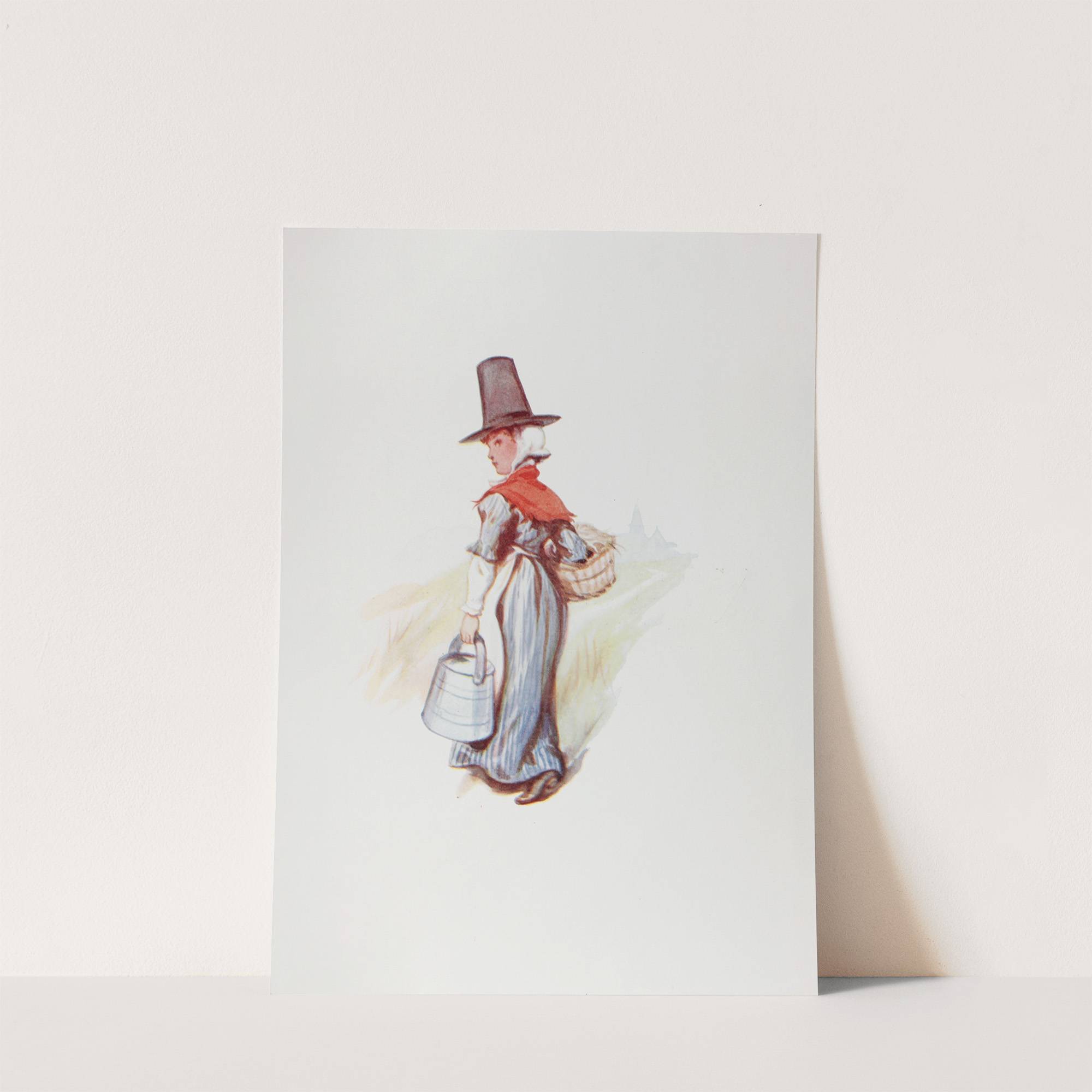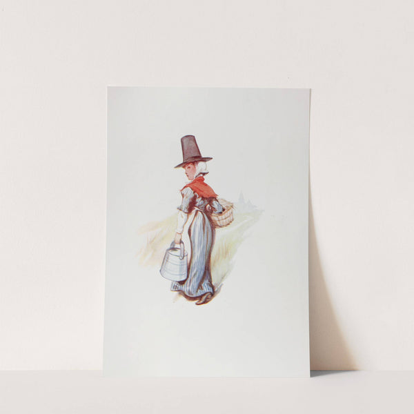 This captivating print titled "Welsh" by artist A.H. Collins features a charming rural scene of a young woman walking towards the viewer. She is depicted with striking clarity in muted tones of blue and gray, which contrast beautifully against the...
