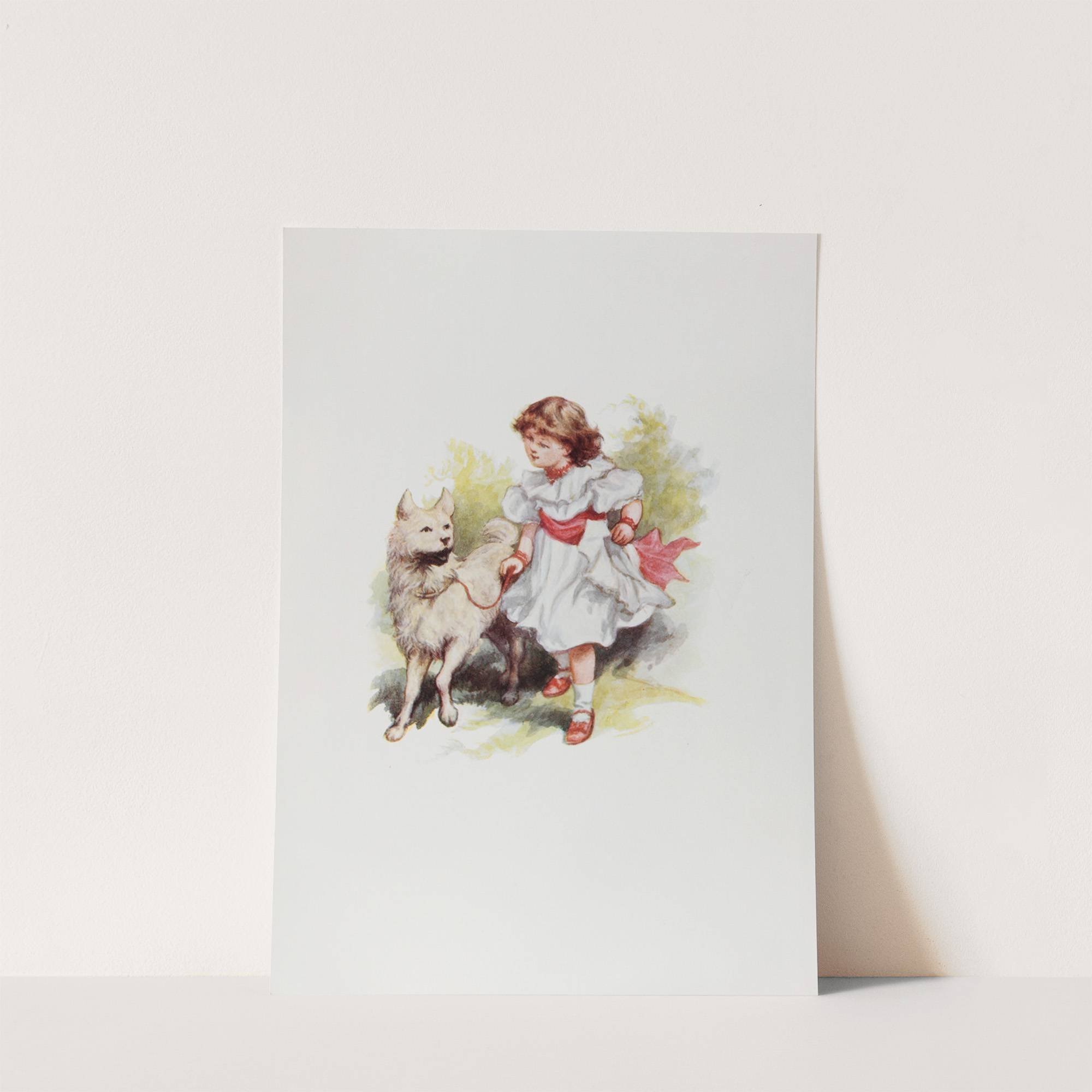 This charming artwork by A.H. Collins depicts a little girl and her loyal dog in a beautifully illustrated scene. The girl, with short brown hair, is dressed in an elegant white dress accented with puffed sleeves and a bright red...