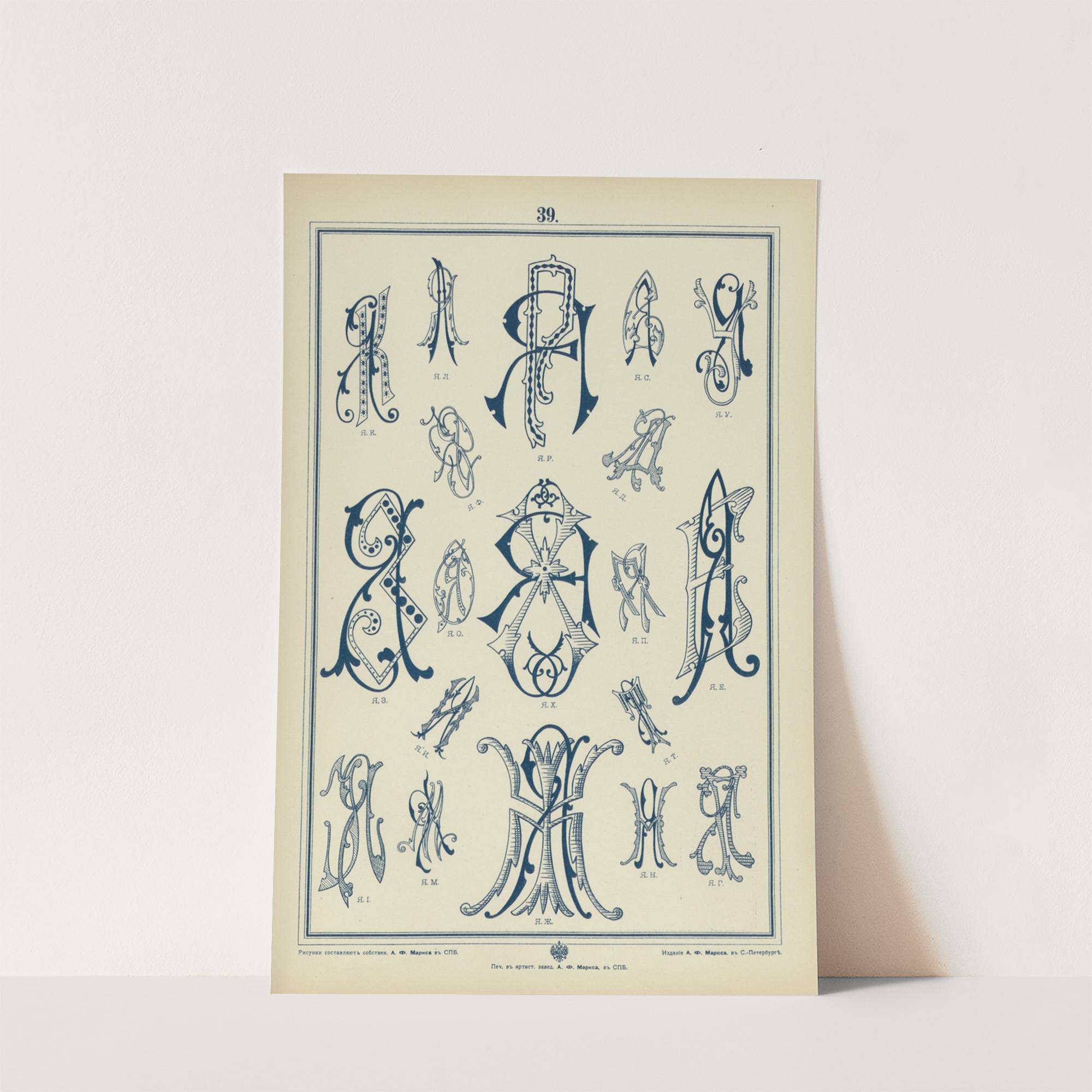 Introducing "Monogrammy Pl.39" by A. Litke, a captivating piece of art that showcases an intricate collection of monograms in various styles. This elegant design features an array of unique letter forms, each meticulously rendered in deep blue ink against a...