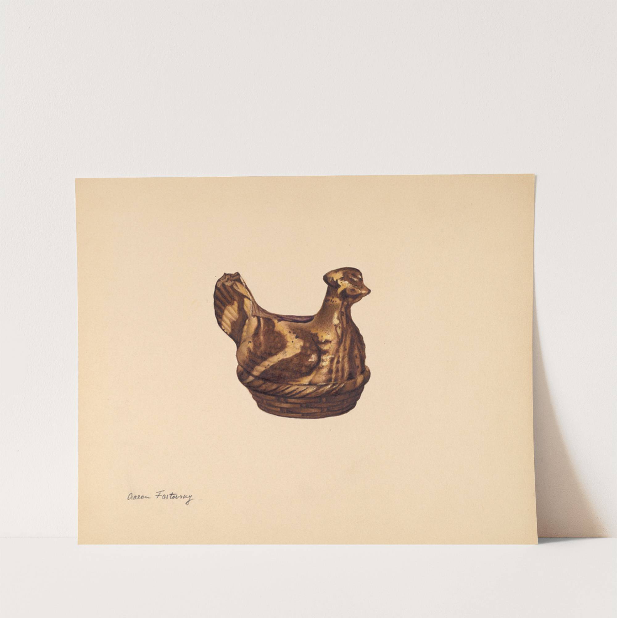 This art print features a beautifully detailed watercolor painting of a single chicken, titled "Bank" by artist Aaron Fastovsky. The chicken is centrally positioned against a clean, pale cream background that provides a gentle contrast to highlight the bird's form...