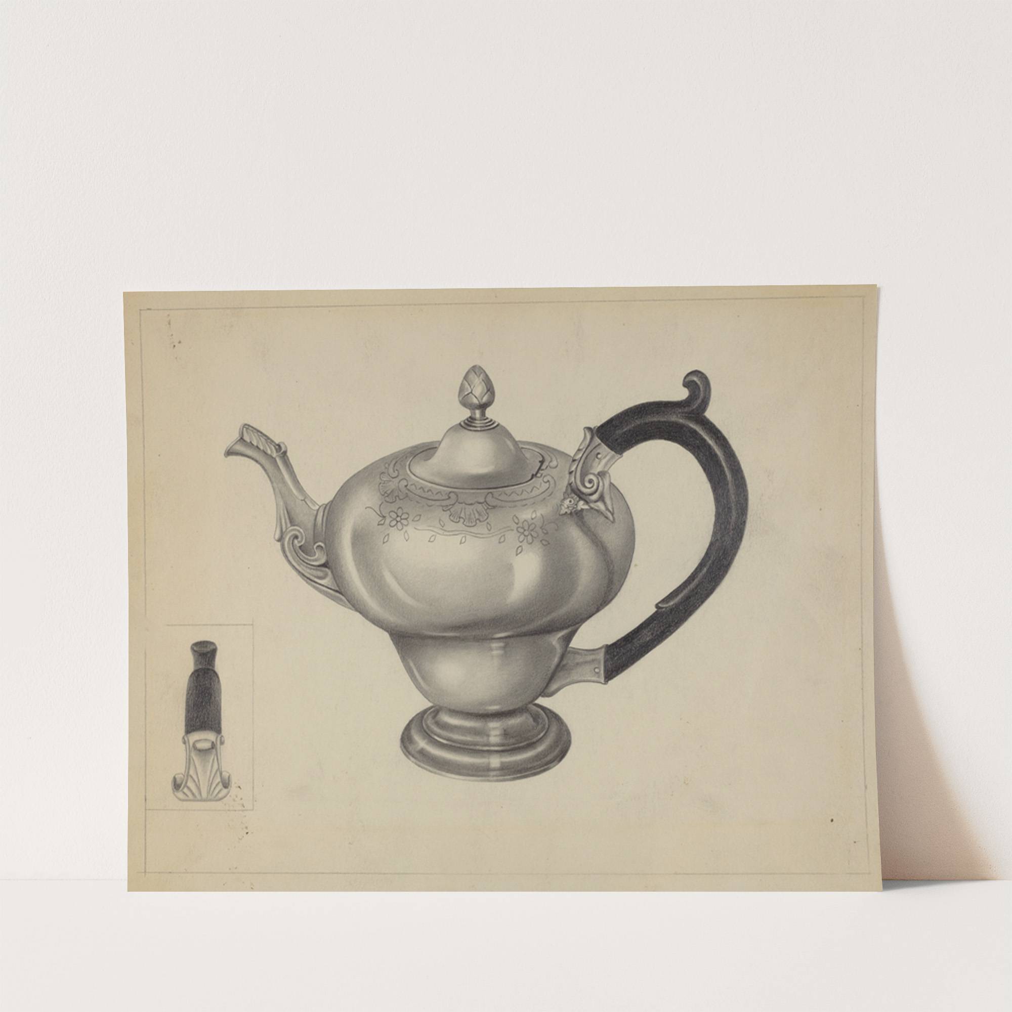 This exquisite art print showcases "Silver Teapot" by artist Aaron Fastovsky. The teapot is rendered in meticulous grayscale pencil detail, highlighting its elegant metallic texture and classic design. The teapot has a rounded body with ornate floral engravings near the...