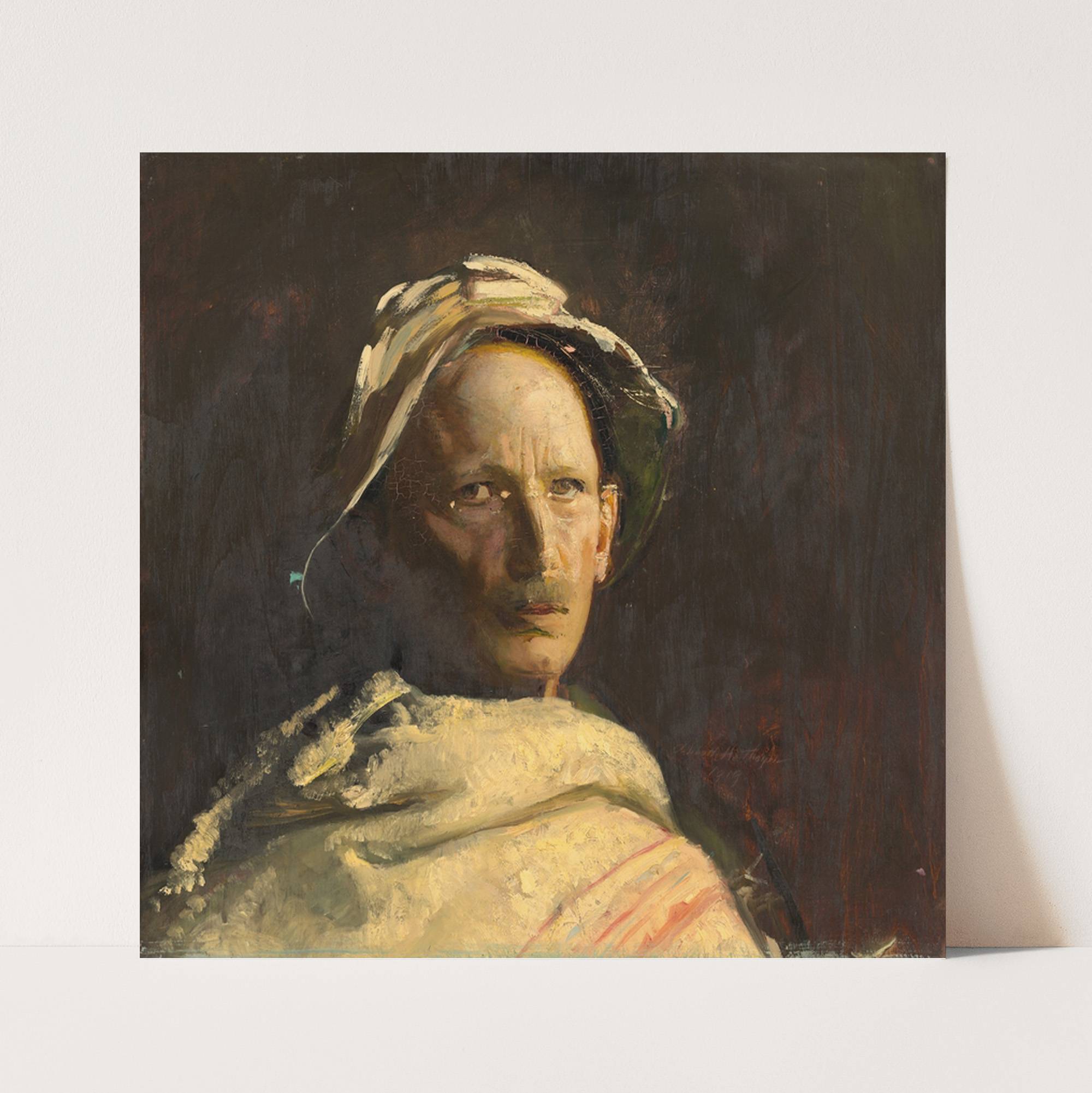 This striking portrait features "Self-Portrait" by Abbott Handerson Thayer, painted in 1919. The artist's skillful brushwork captures a nuanced expression on the subject’s face, with a blend of warm and cool tones creating depth and contrast. The figure is adorned...