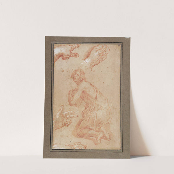 This elegant art print showcases "Studies of Hands" by the renowned artist Abraham Bloemaert. Executed in delicate red chalk on beige paper, this classical drawing captures an intricate interplay between human gestures and forms. The central figure is a semi-nude...