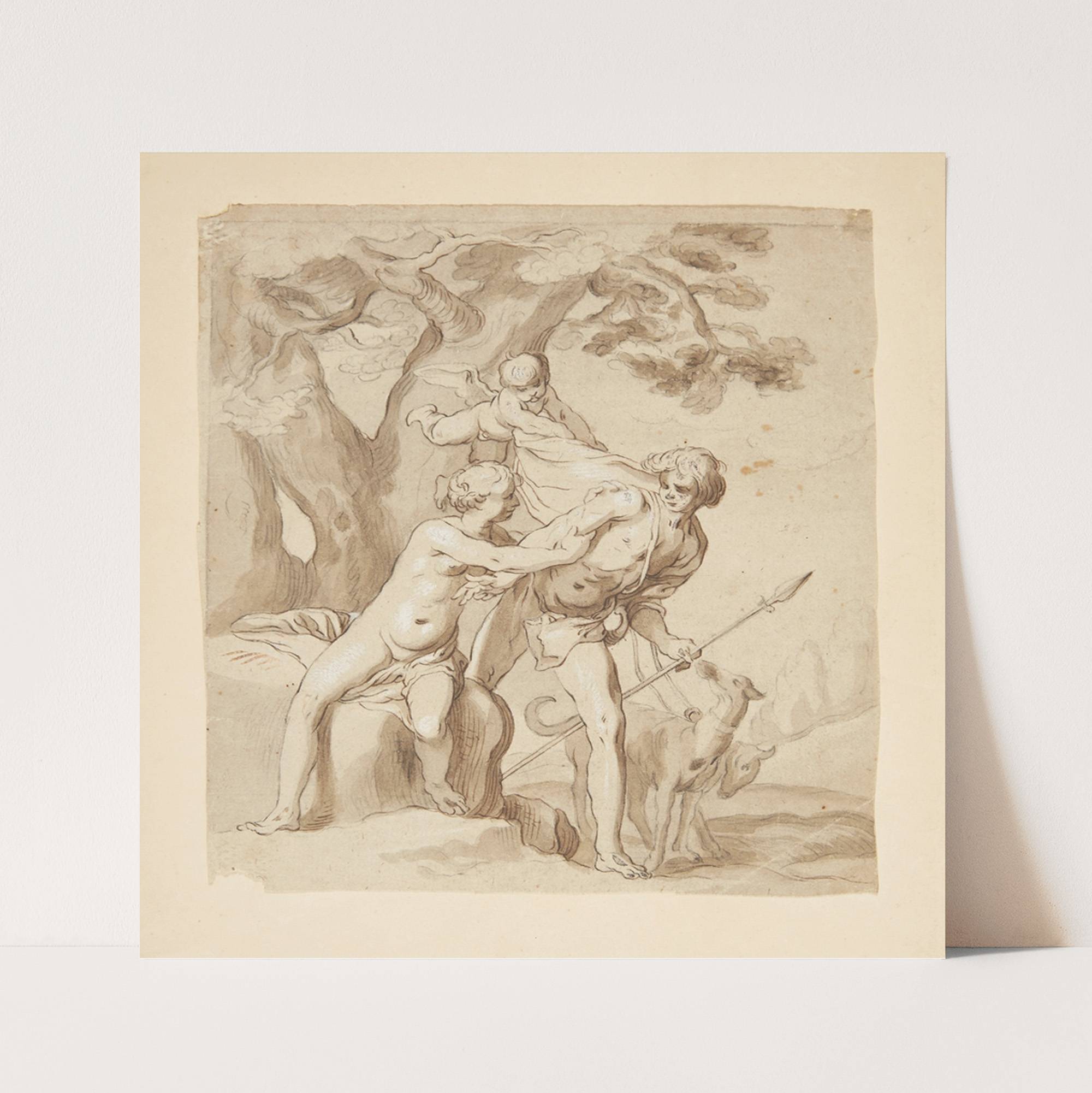 This evocative monochromatic drawing captures the dynamic intensity of "Venus and Adonis" by Abraham Bloemaart, rendered in sepia tones that evoke a timeless classicism. The scene features three central figures: Venus, Adonis, and an ambiguous third male figure. Venus, portrayed...