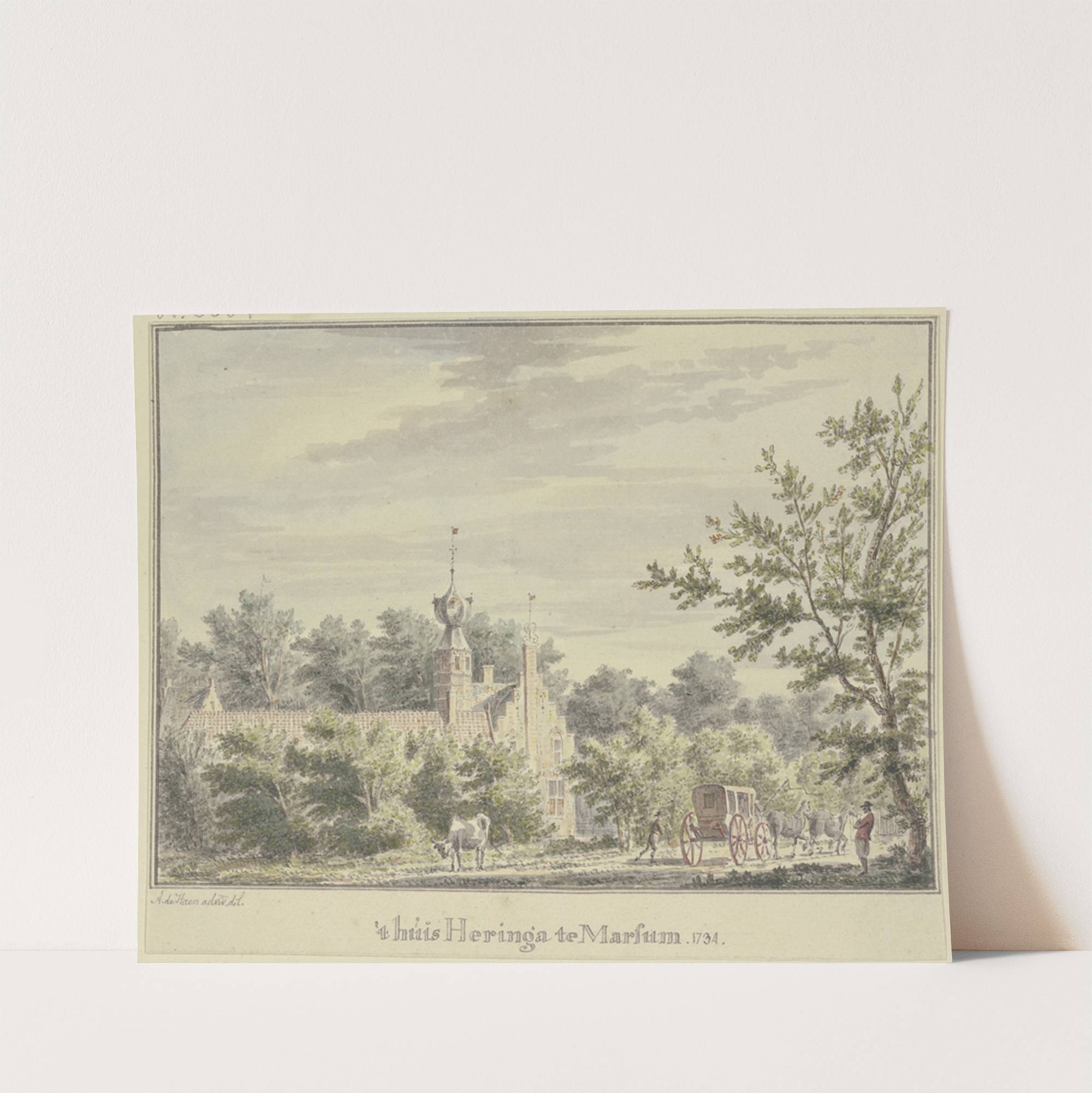 This art print features "Huis te Marsum" by Abraham de Heere the Younger, beautifully capturing an 18th-century Dutch landscape scene. The painting showcases a charming view of a stately mansion surrounded by lush greenery and tall trees. The mansion, with...