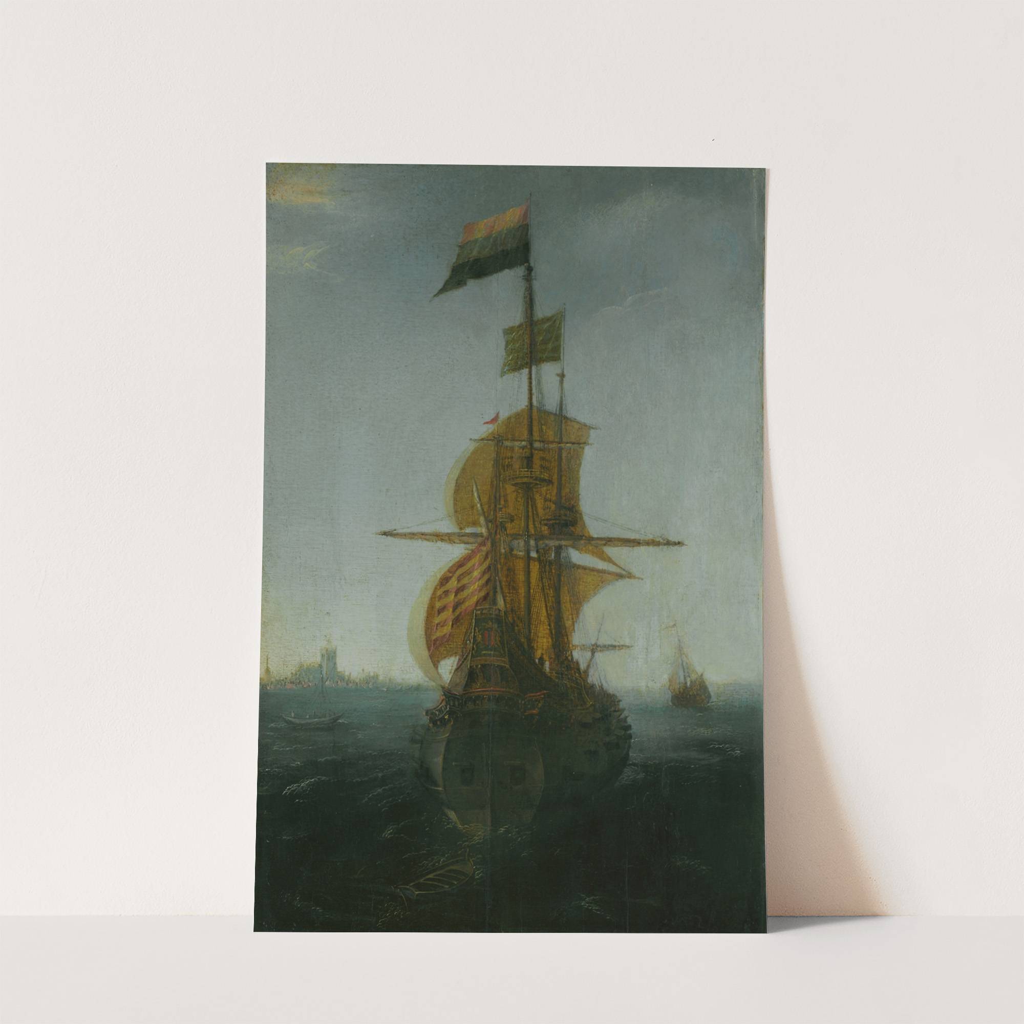 This captivating art print features "An Amsterdam East Indiaman" by Abraham de Vos, capturing the majestic presence of a Dutch sailing ship on the open sea. The central figure is a robust Indiaman ship, adorned with multiple flags fluttering at...