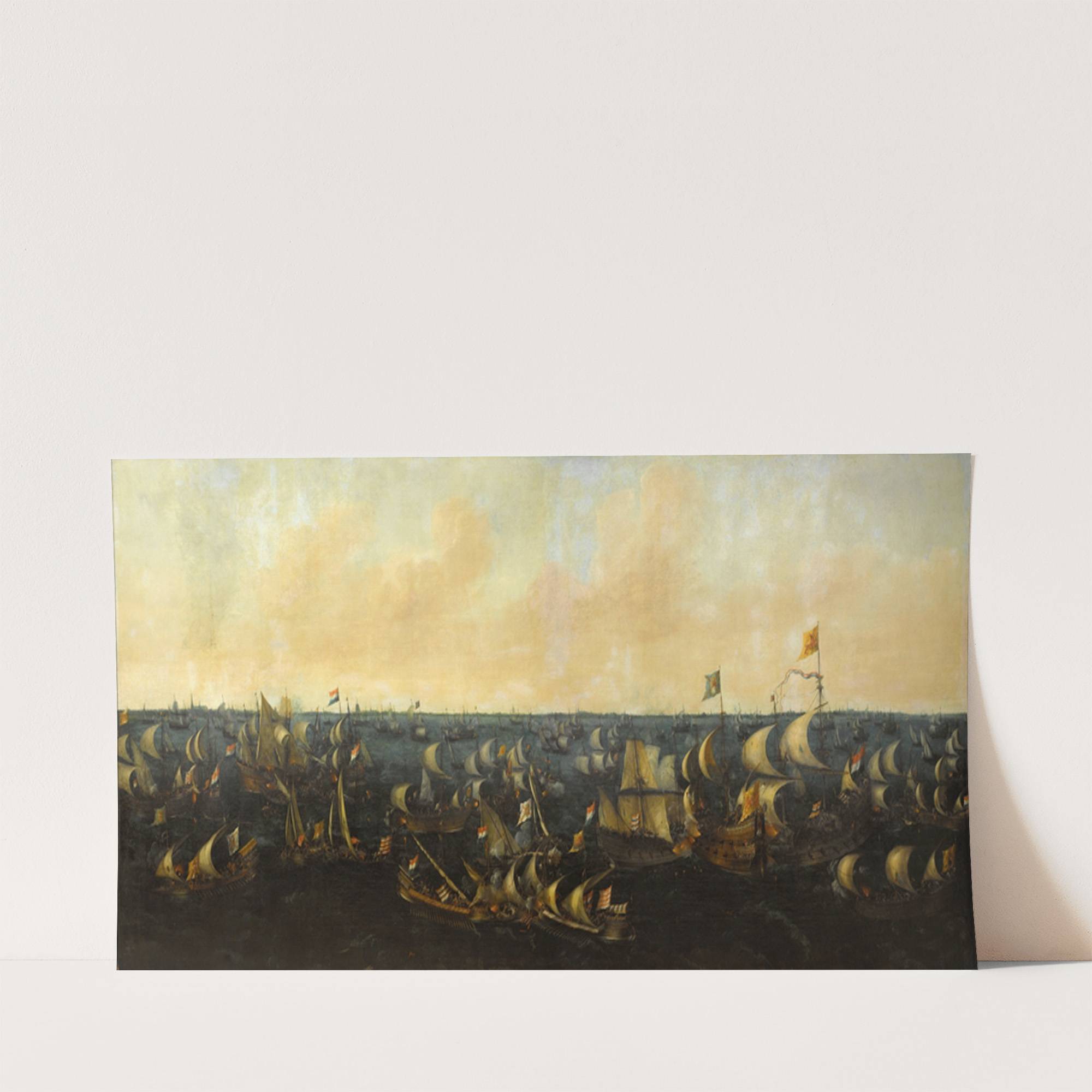 This art print features a stunning historical naval battle scene titled "Naval Battle on the IJsselmeer, 6 October 1573; Episode from the Eighty Years' War," created by Abraham de Vos. The composition captures the intense chaos of an old maritime...