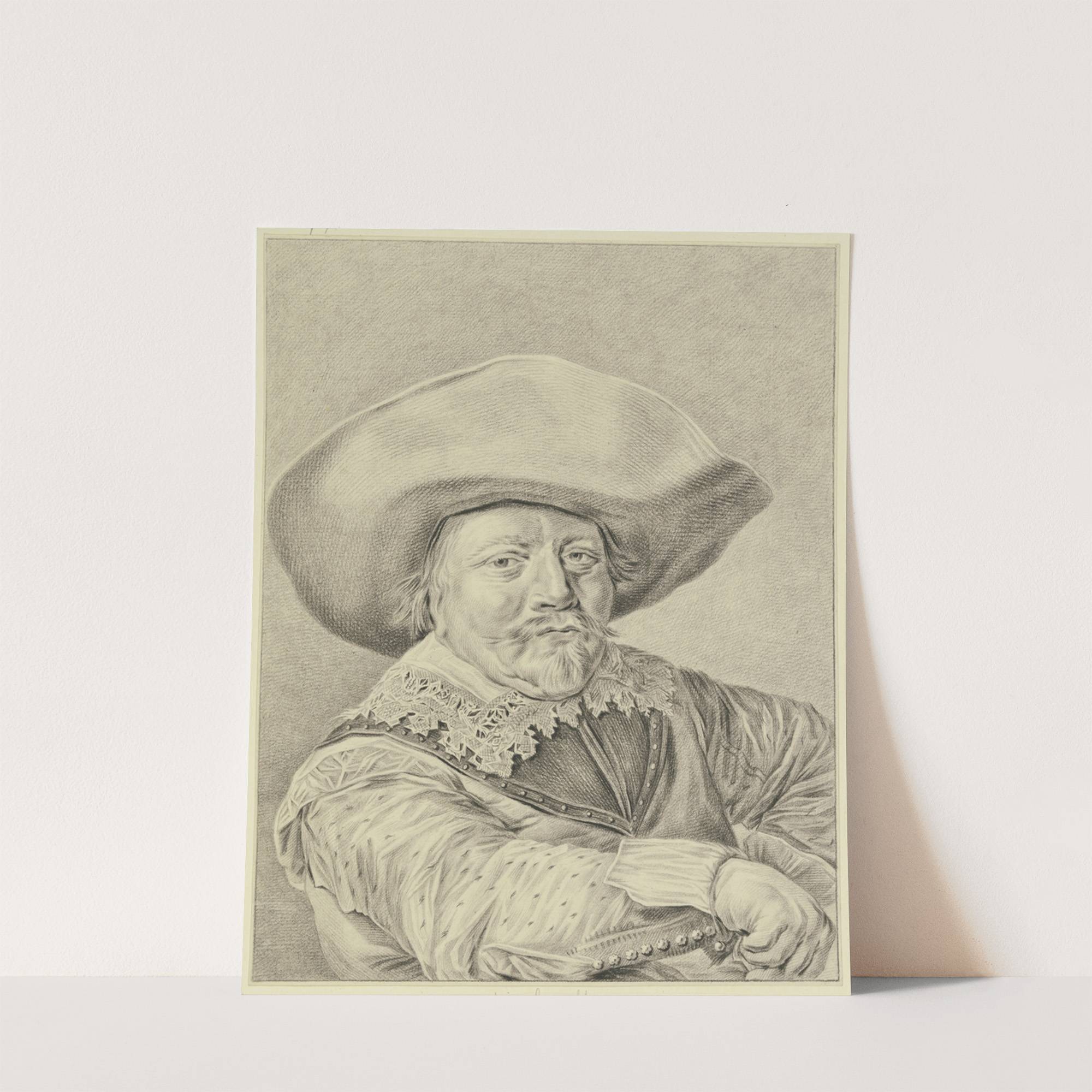 This exquisite black-and-white etching captures the refined portrait of an elderly gentleman from the Renaissance period. The subject is adorned in an elaborate outfit that includes a lace-trimmed shirt, richly textured sleeves, and a prominent broad-brimmed hat that adds to...