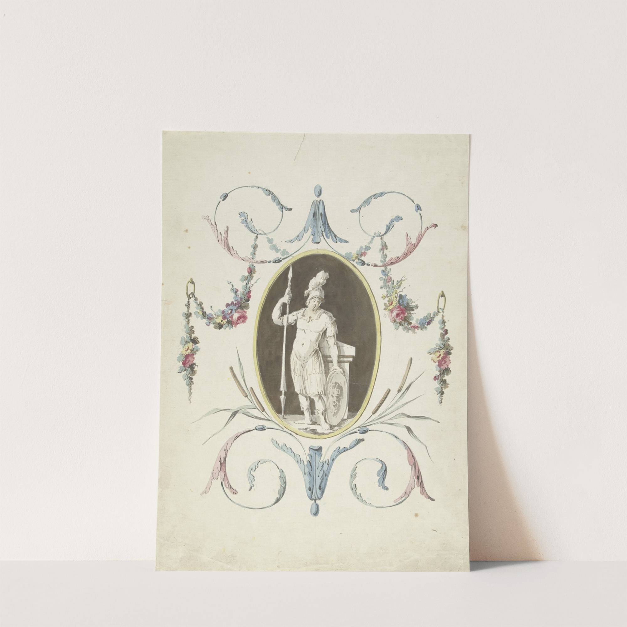 This exquisite art print features a classical illustration of a standing warrior, rendered in delicate monochrome lines with a touch of color. The central figure, adorned in traditional Roman or Greek attire, holds a tall spear upright in his right...