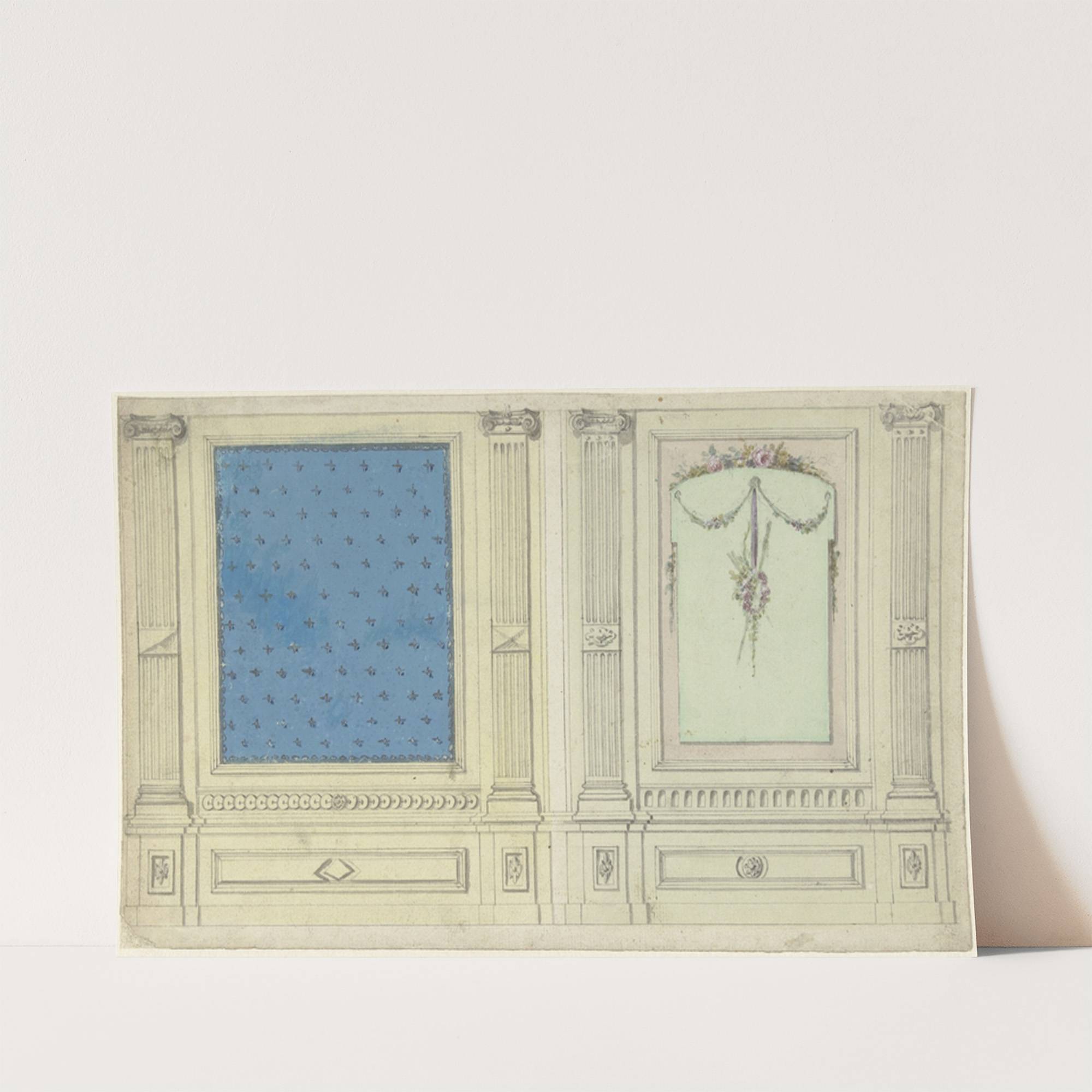 This elegant art print by Abraham Meertens features a beautifully detailed classical interior design. The left panel showcases a square section with a vivid blue background adorned with subtle, star-shaped patterns in darker blue, creating a delicate and serene effect....
