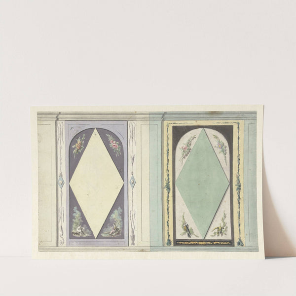 This elegant piece of art captures two intricately detailed wall panels adorned with geometric diamond shapes, each framed within an ornate border. The left panel features a dark purple background accented with delicate floral patterns and green foliage that add...