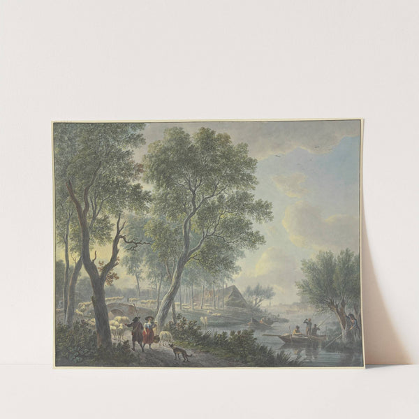 This vibrant art print, titled "Links begleitet ein Schafhirte einem Milchmädchen," is a captivating landscape painting by Abraham Teerlink. It depicts a serene riverside scene bustling with life and activity. In the foreground, a shepherd boy leads a sheep alongside...