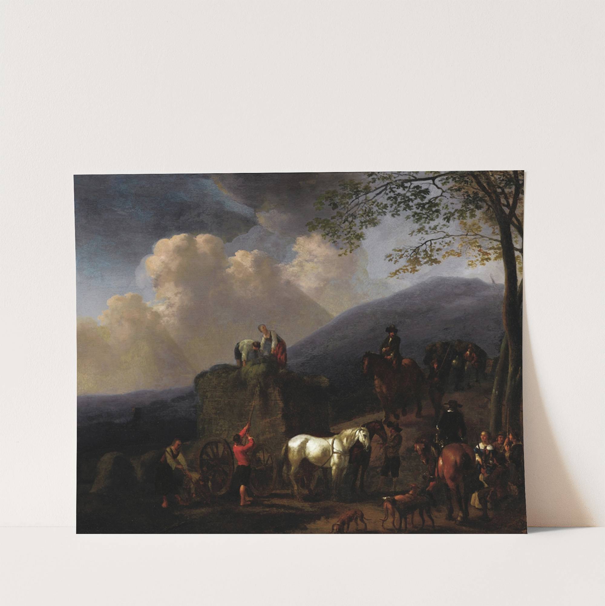 This striking art print features "Hay Harvest" by Abraham van Calraet, capturing a rustic rural scene with dramatic realism. The composition showcases a group of farmers and their animals in a twilight landscape. Central to the image is a prominent...