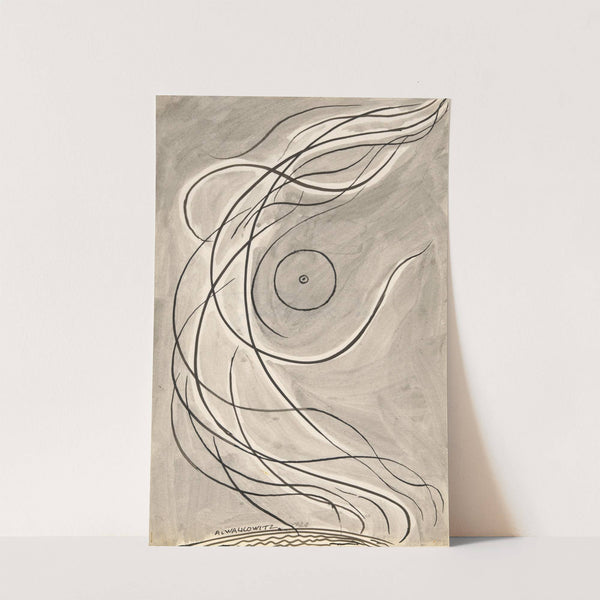 This is "Dance Abstraction; Isadora Duncan (or 'Rhythmic Line')" by Abraham Walkowitz. The artwork features an elegant, minimalist abstract design in black and white. At its center is a small, circular shape surrounded by fluid, sweeping lines that gracefully curve...