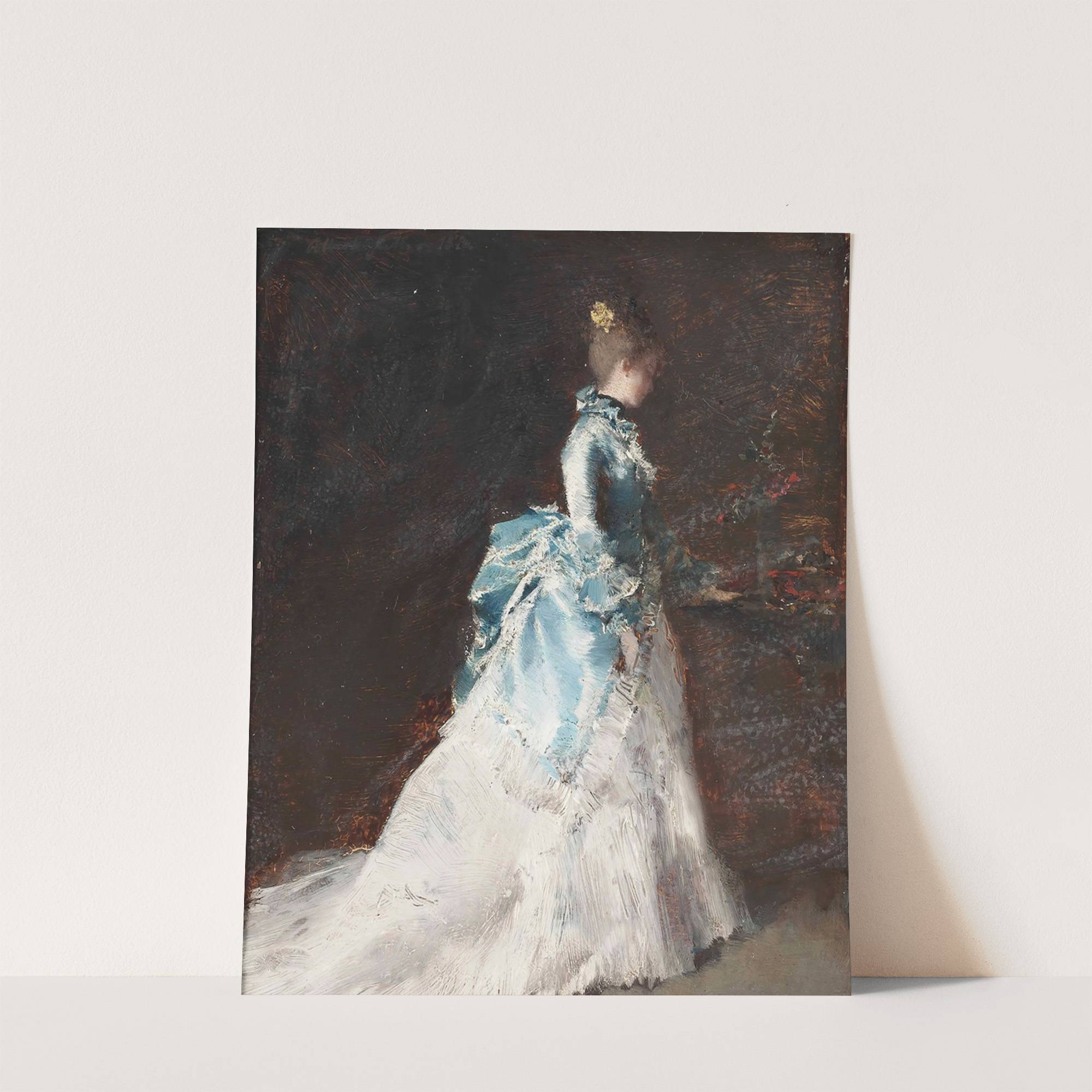 This captivating art print depicts "Flower Arranging in an Interior" by the renowned artist Albert von Keller. The composition features a beautifully dressed woman captured in profile against a dark, almost black background, which serves to highlight her elegant figure...