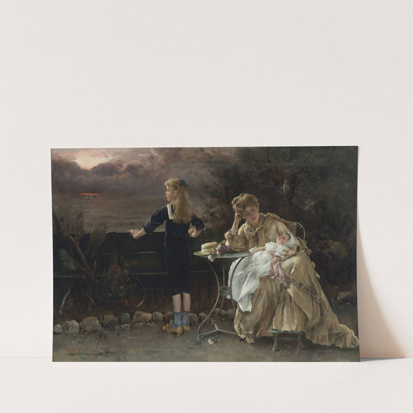 This exquisite art print features "Mère Et Ses Enfants" by Alfred Stevens, capturing a tender yet poignant moment in a Victorian-style painting. The scene is set against a dark, stormy sky with muted, cloudy hues that convey a sense of...