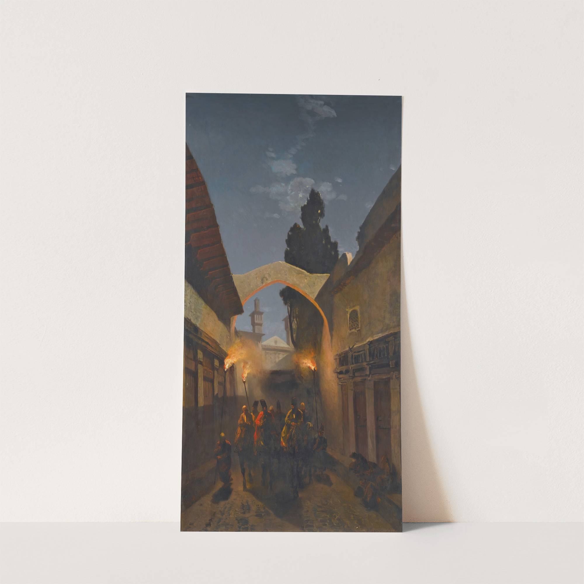 This stunning art print depicts "Nocturnal Cavalcade, Tehran" by Alberto Pasini, capturing the essence of an ancient Middle Eastern night scene. The composition features a narrow, cobblestone alleyway framed by rustic buildings with aged, weathered textures and brown tiled roofs....