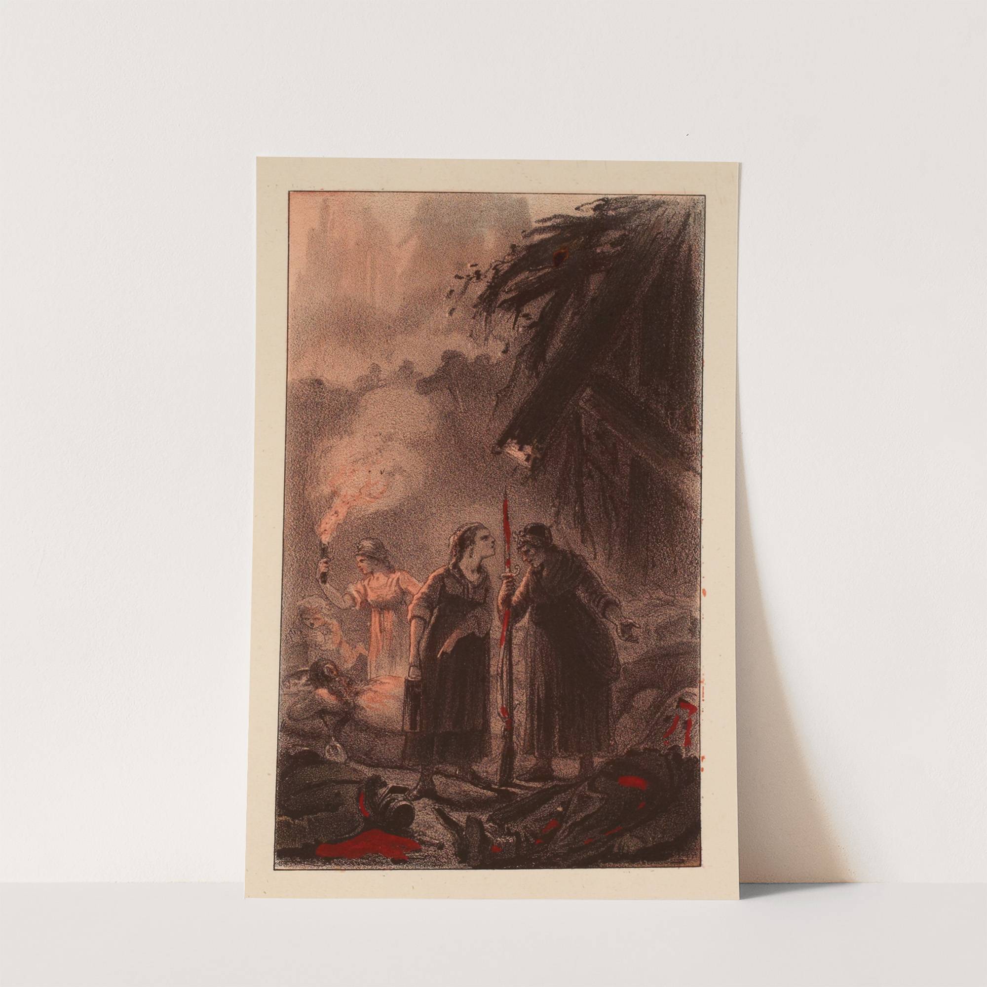 This art print features "Les Pétroleuses" by Achille Beloche, rendered in rich, sepia-toned hues with dramatic red accents. The scene depicts two figures standing under a dark, imposing palm-like structure. The foreground character is cloaked in shadows, holding a tall...