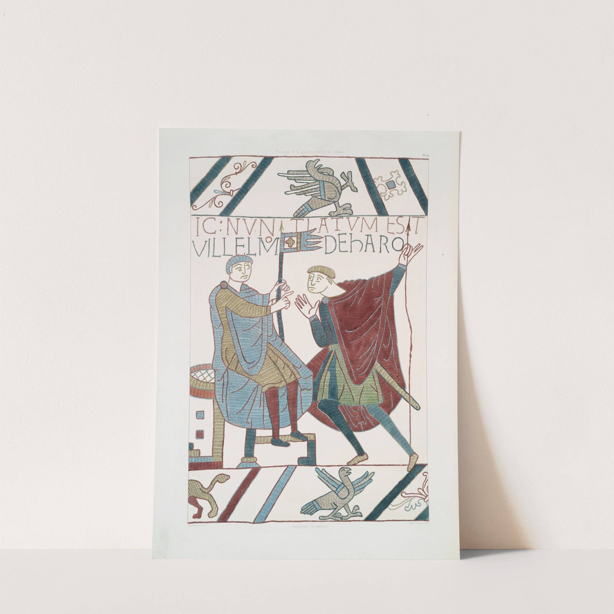 This art print features a vibrant depiction of two historical figures in an animated style inspired by medieval tapestries. The left figure is dressed in a blue robe with geometric patterns, seated on a stool with red legs. His right...