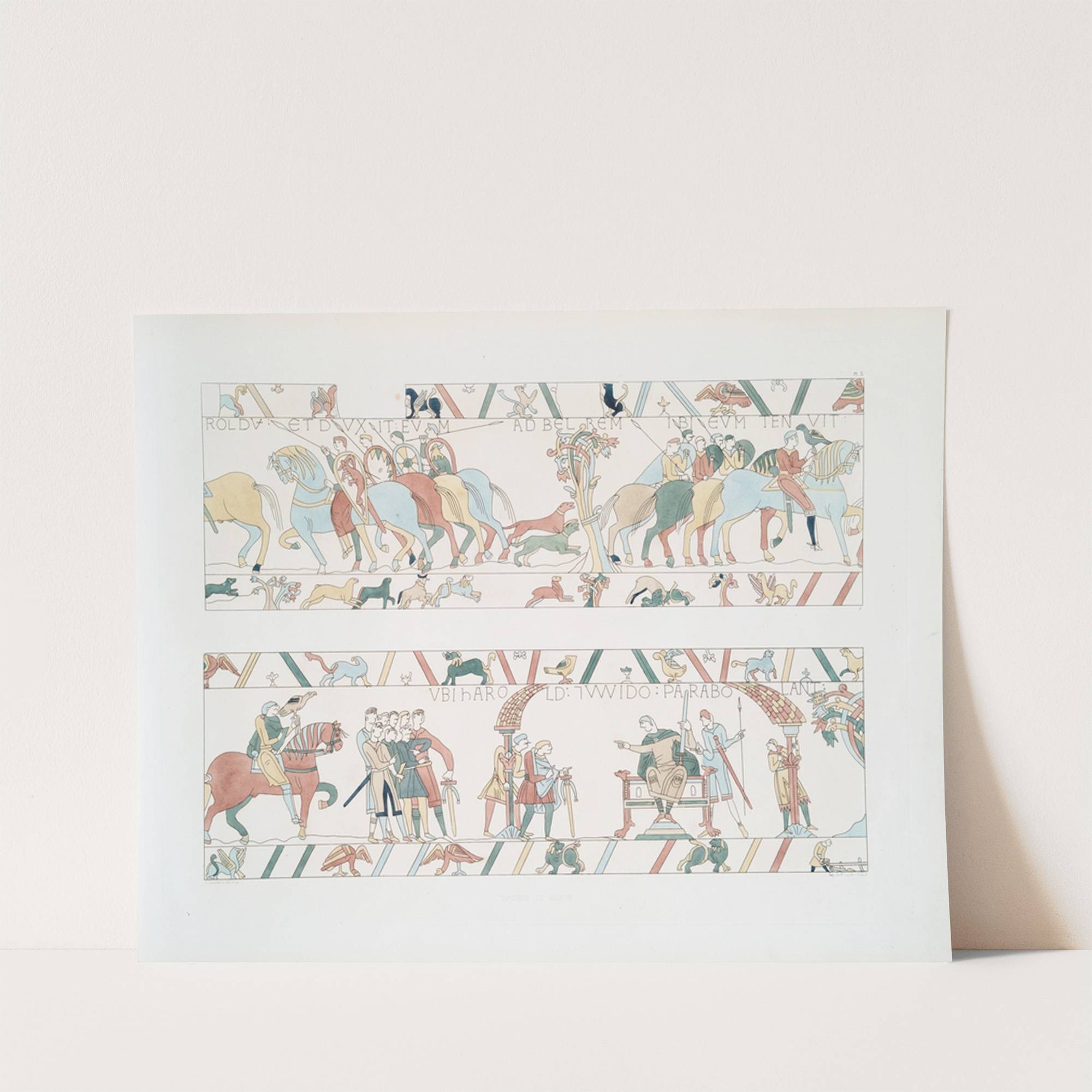 This art print features "Tapisserie de Bayeux 3" by the artist Achille Jubinal, presented in a minimalist, pastel color palette with clean lines and simple shading. The scene is bustling with lively activity, depicting multiple human figures and animals interacting...