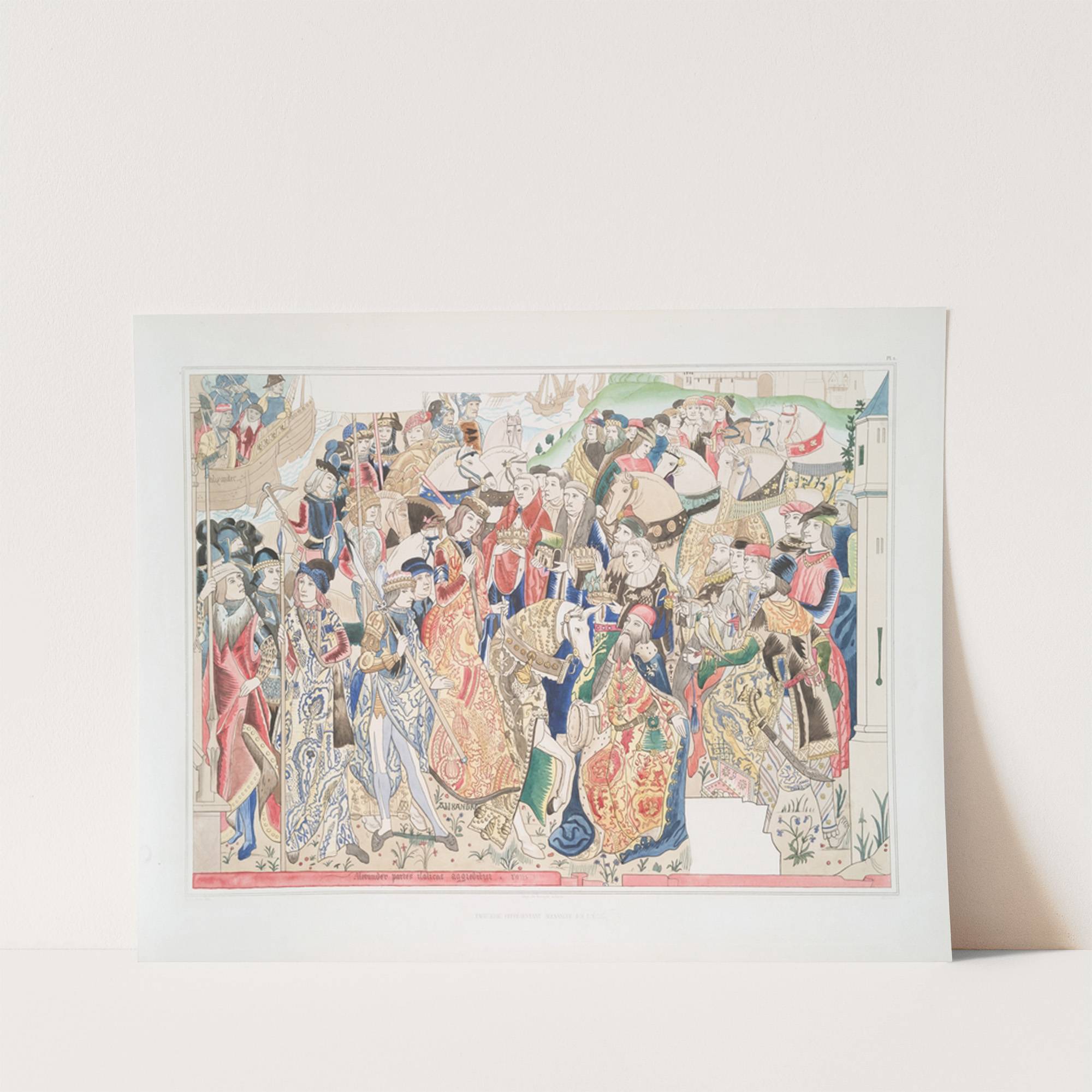 This vibrant art print depicts "Tapisserie représentant Alexandre roi d'Écosse" by Achille Jubinal. The colorful scene is filled with an abundance of characters in detailed, ornate clothing typical of the Scottish court. At the center, a regal figure dressed in...