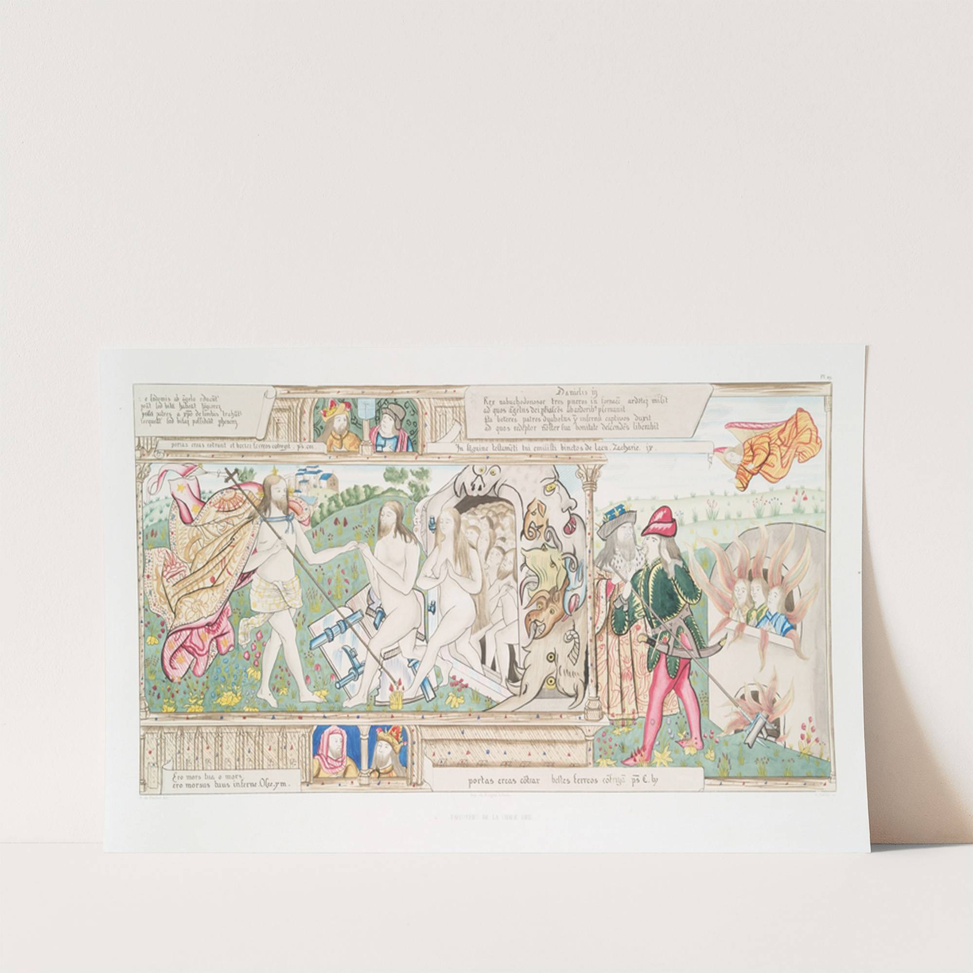 This vibrant illustration titled "Tapisseries de la Chaise Dieu 29" by Achille Jubinal showcases a lively medieval scene in a whimsical, semi-abstract style. The composition is divided into several dynamic panels depicting various moments and characters.On the left, a detailed...