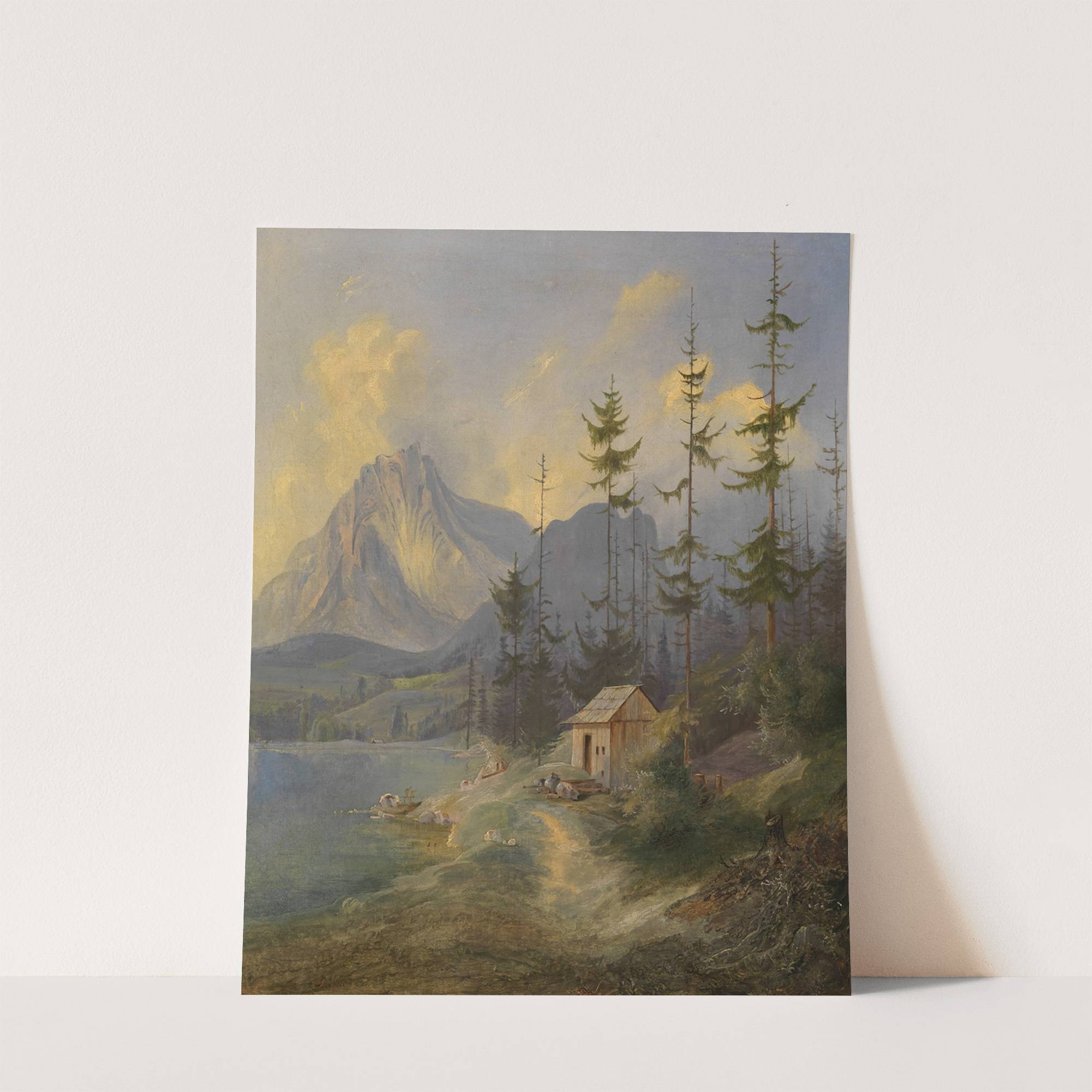 Discover tranquility with "Der Sarstein bei Alt-Aussee" by Adalbert Stifter. This beautiful oil painting captures the serene beauty of a rustic mountain landscape. The scene is dominated by towering pine trees, their tall, slender forms adding vertical interest against the...
