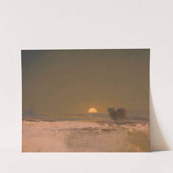 This serene landscape print captures the beauty of a sunset over a tranquil seascape. The warm, golden hues of the setting sun dominate the center of the composition, creating a radiant glow that contrasts with the cool, darkening sky above....
