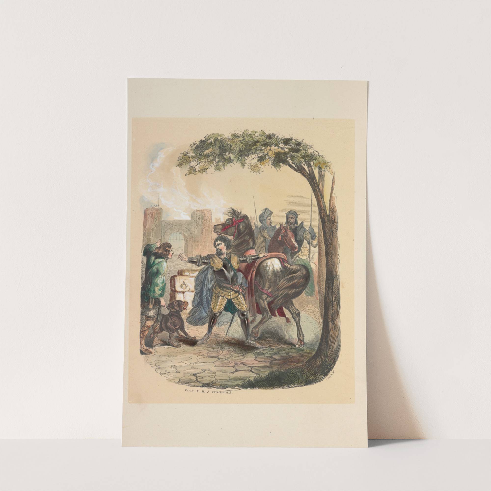 This artwork, titled "Adama Mickiewicza Konrad Wallenrod i Grażyna Pl.19 (1851)" by Adam Mickiewicz, showcases a vivid and dynamic scene filled with historical detail and color. The composition centers around a young woman in elegant medieval attire, including a blue...