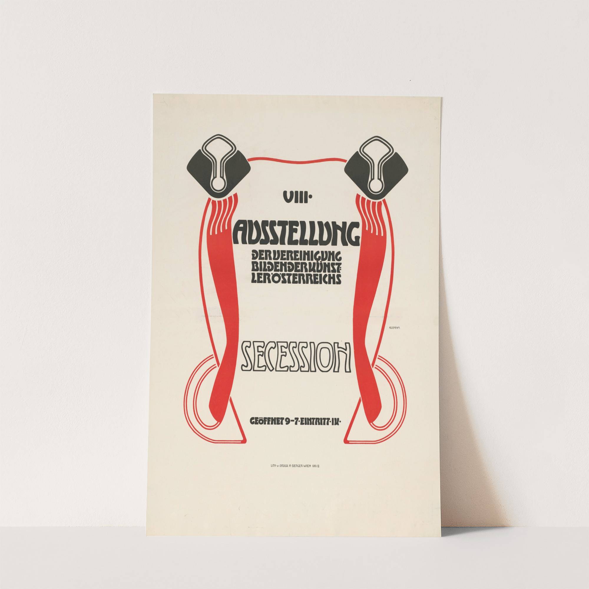 This vibrant art print showcases a strikingly modern poster design from the turn of the century, inspired by the Viennese Secession movement. The centerpiece features bold red lines forming an abstract figure resembling outstretched hands or stylized legs, set against...