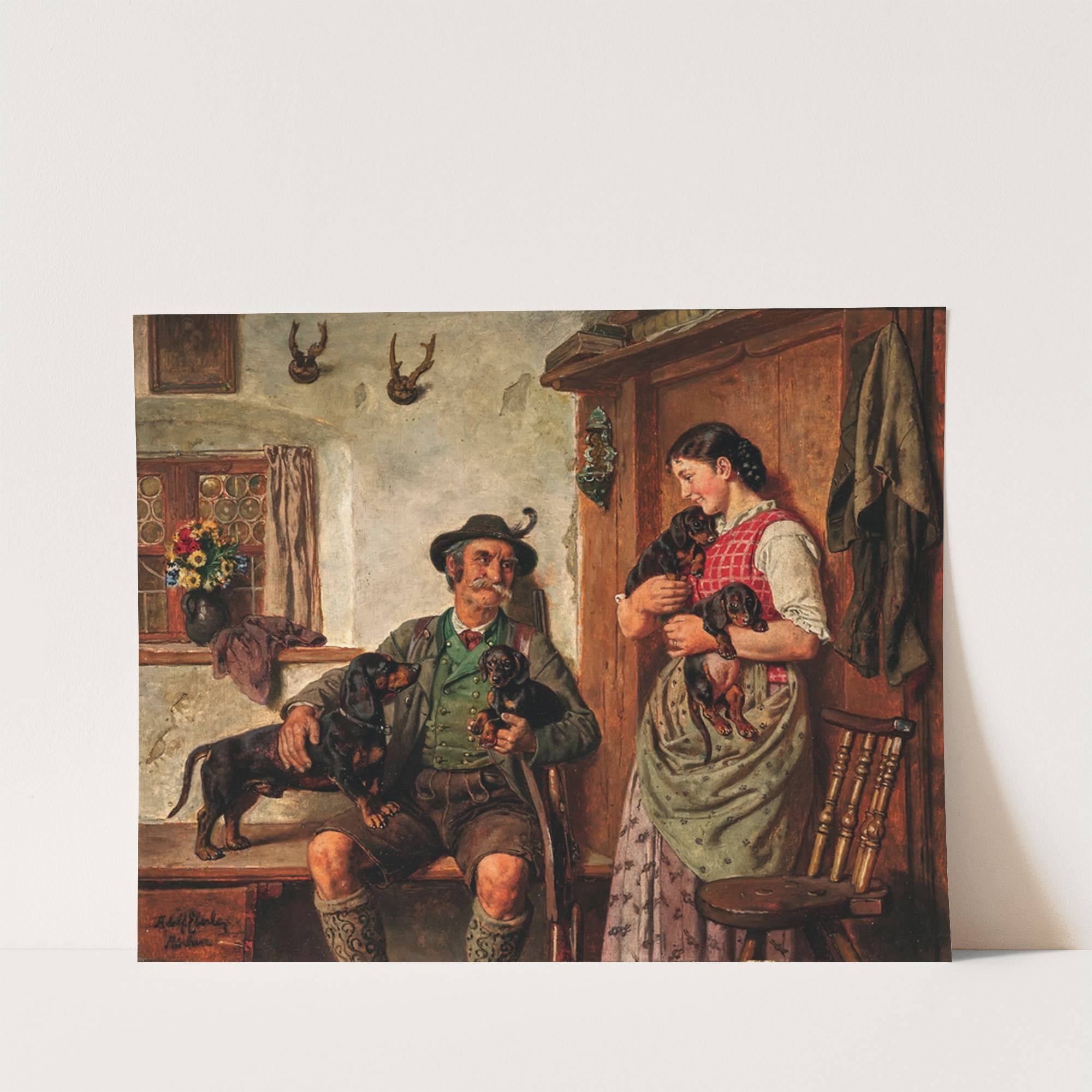 This beautifully detailed art print captures "A Hunter with Alpine-Dachsbracke Puppies" by Adolf Eberle. The scene features an older hunter seated comfortably on a wooden chair, his mustachioed face displaying a gentle smile as he cradles two small Dachsbracke puppies....