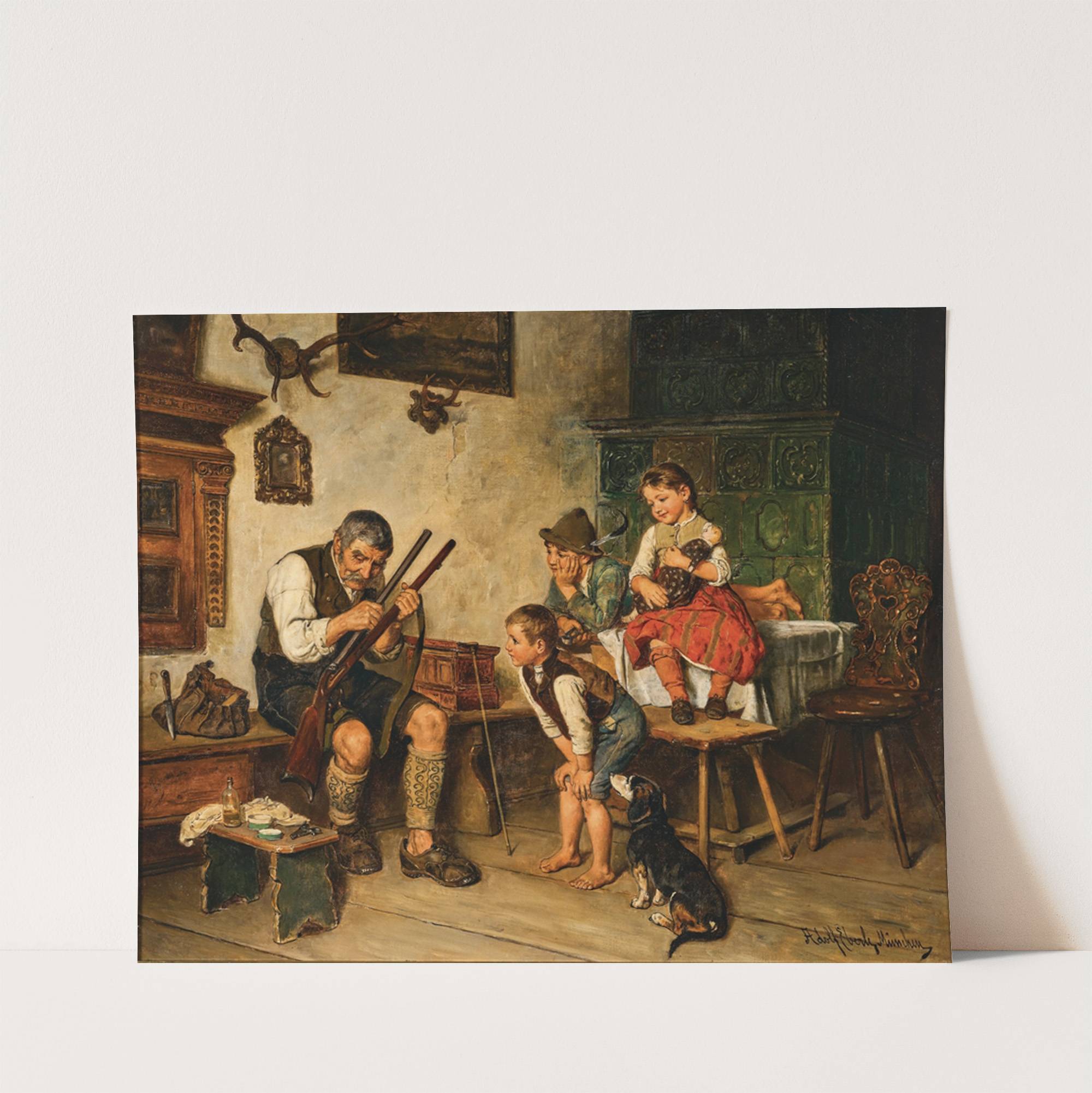 This richly detailed painting captures a rustic, homely scene with a warm, nostalgic feel. The artist, Adolf Eberle, has created a vivid tableau of family life in a traditional, rural setting.At the center, an older man with a weathered face...
