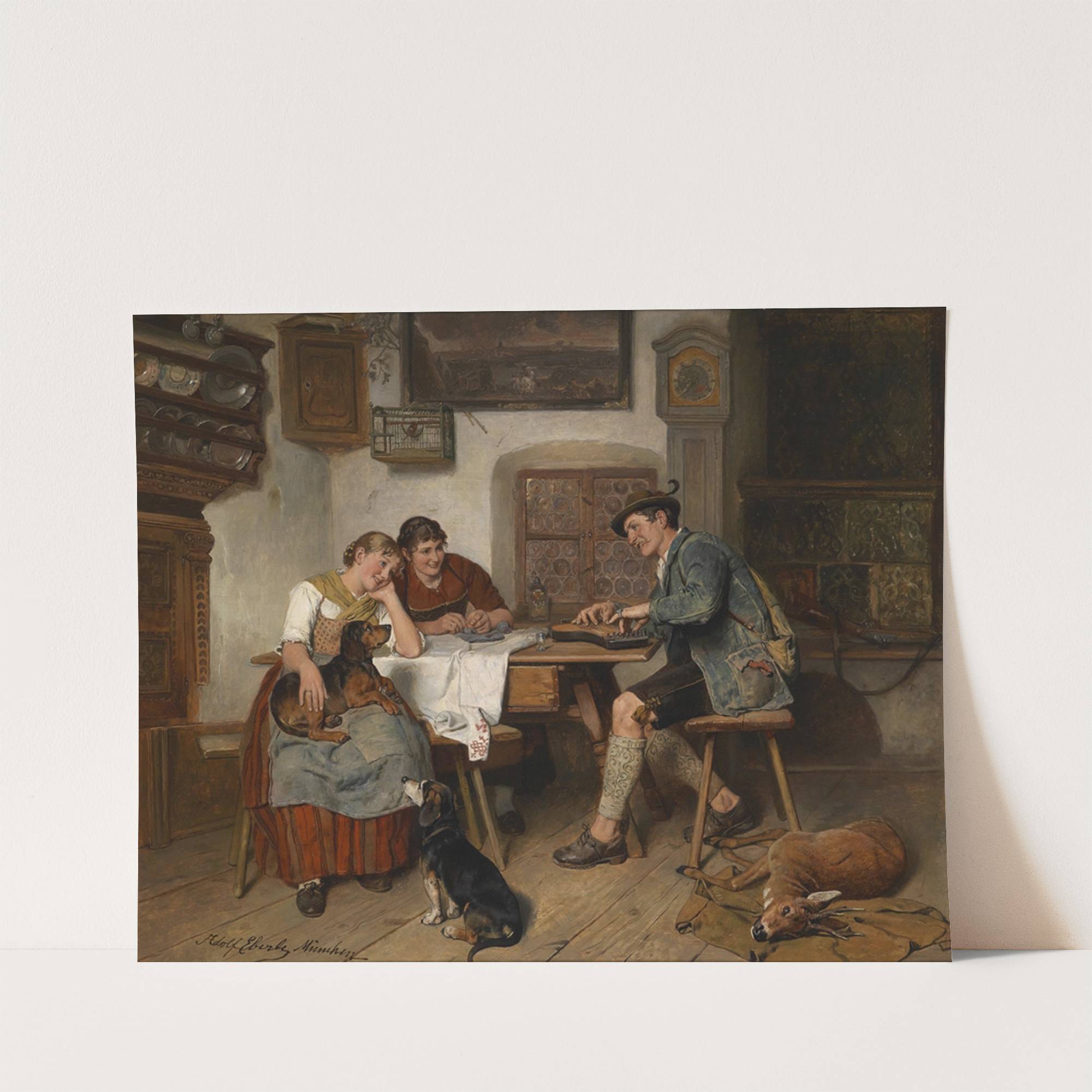 This charming art print by Adolf Eberle titled "Musikalische Unterhaltung auf der Alm" brings to life a warm, rustic scene from a traditional Alpine village. Three figures are engaged in a lively conversation around a wooden table. On the left,...