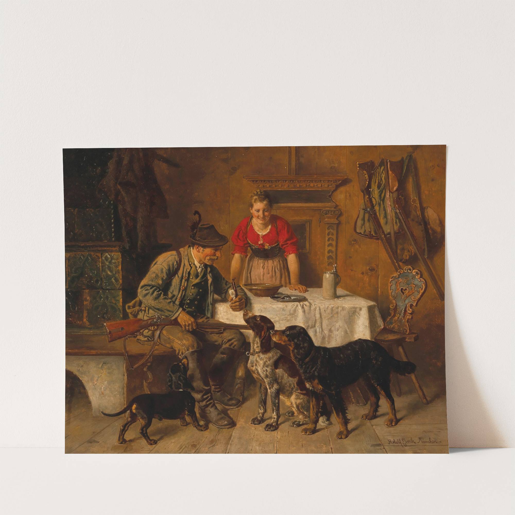 This captivating art print features "Off to the Hunt" by Adolf Eberle, a masterful painting that exudes rustic charm and warmth. The scene is set in a cozy, warmly lit room with rich, earthy tones dominating the background. A rugged...