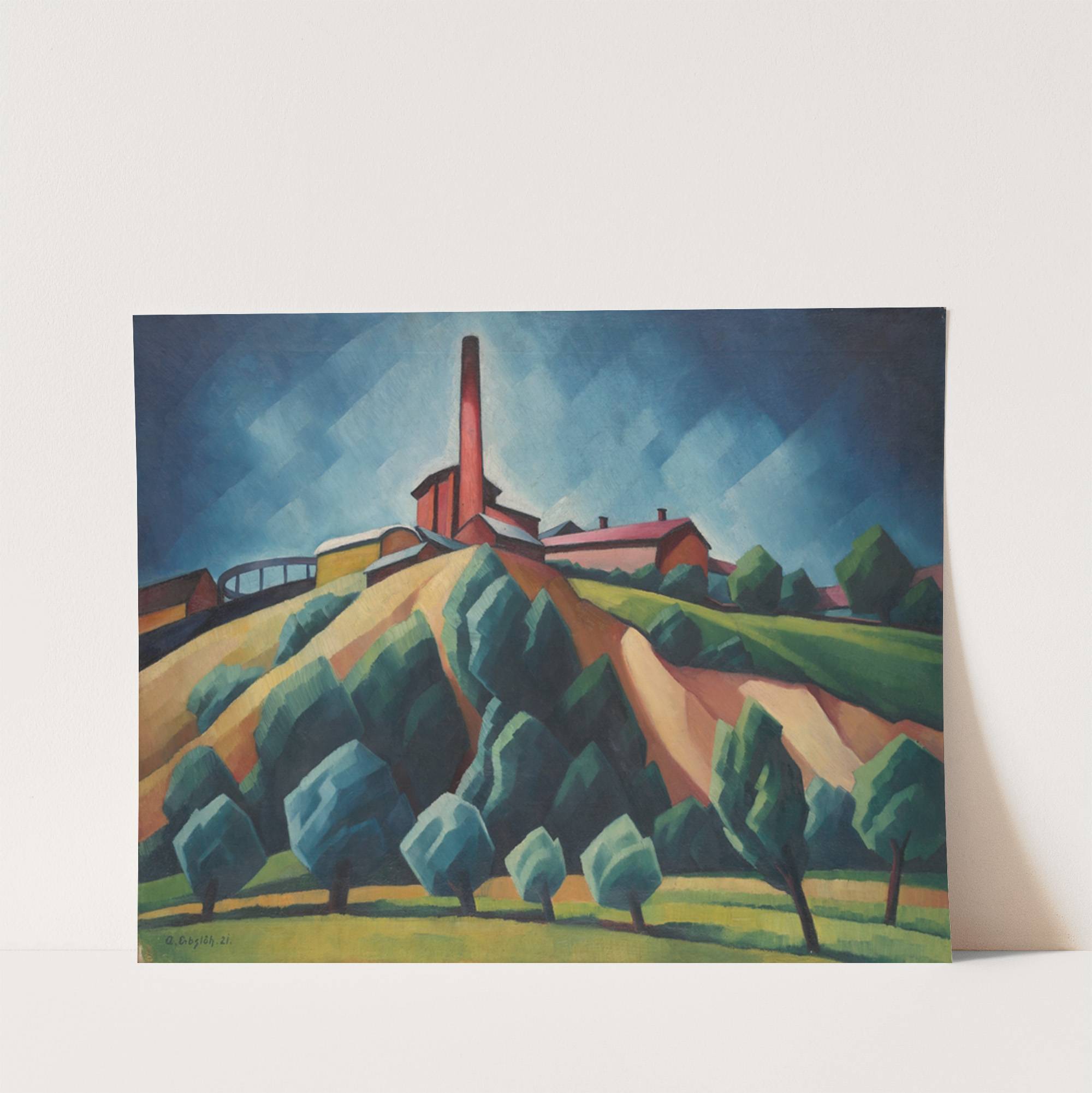 This vibrant painting titled "The Factory" by Adolf Erbslöh depicts a striking industrial landscape in a bold, geometric style. Dominating the composition is an imposing factory building with a tall chimney rising into a dynamic blue sky filled with abstract,...