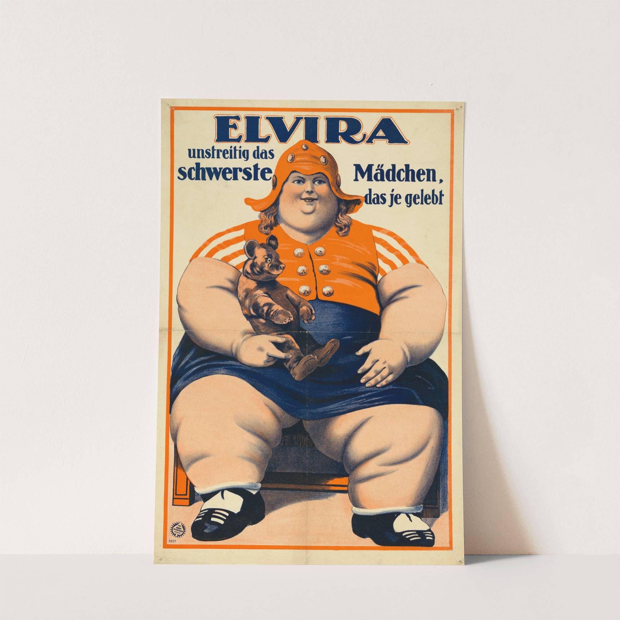 This vibrant art print features "Elvira, unstreitig das schwerste Mädchen, das je gelebt" by Adolf Friedländer Lith., created in 1920. The central figure is a large, plus-size woman with fair skin and curly blonde hair, dressed in an orange shirt...
