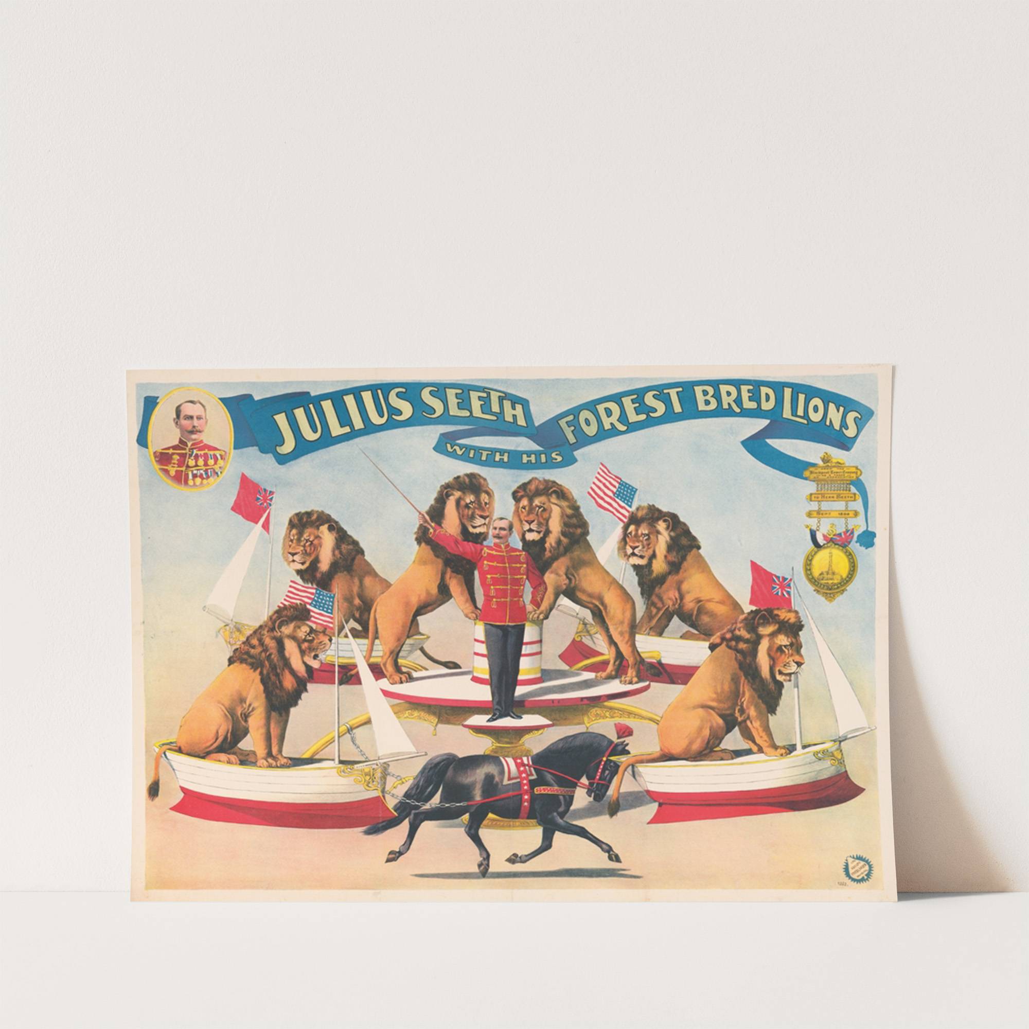 This vibrant art print features "Julius Seeth's Forest Bred Lions," a colorful illustration created by Adolf Friedländer in lithographic style, circa 1893. Dominating the center is a cheerful figure dressed in red and white stripes with black boots, standing confidently...