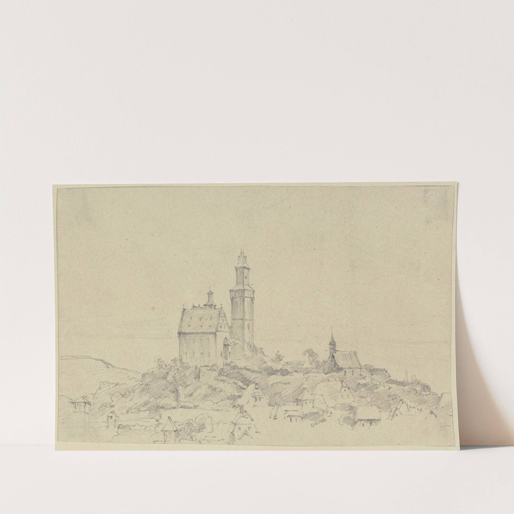 This elegant print features "Kronberg" by the renowned artist Adolf Höffler, capturing a quaint medieval town in meticulous pencil sketch style. The composition showcases an impressive central tower with a distinct bell-like top, flanked by a smaller but equally charming...