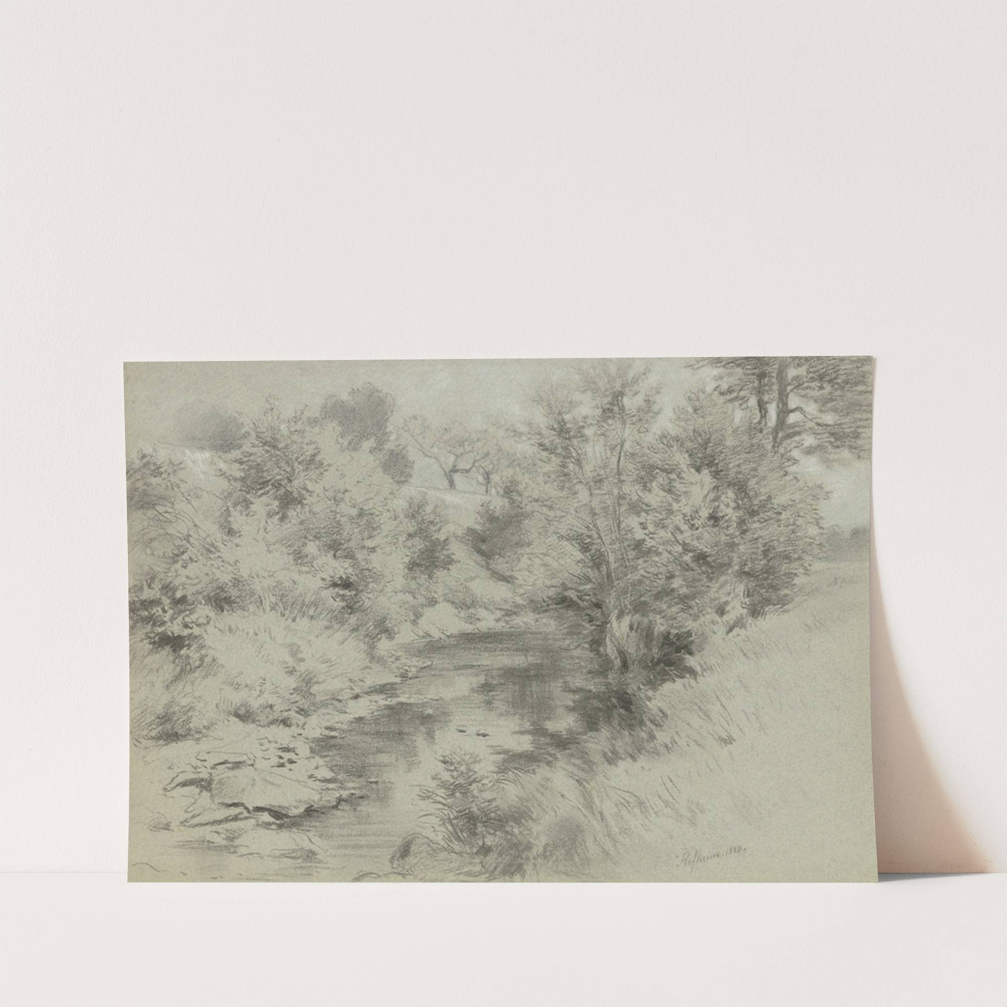 This art print captures the serene beauty of a landscape scene titled "Stream near Hofheim" by Adolf Höffler. The monochromatic illustration, rendered in delicate pencil and charcoal strokes, showcases a tranquil stream meandering through a lush, forested area. The subtle...