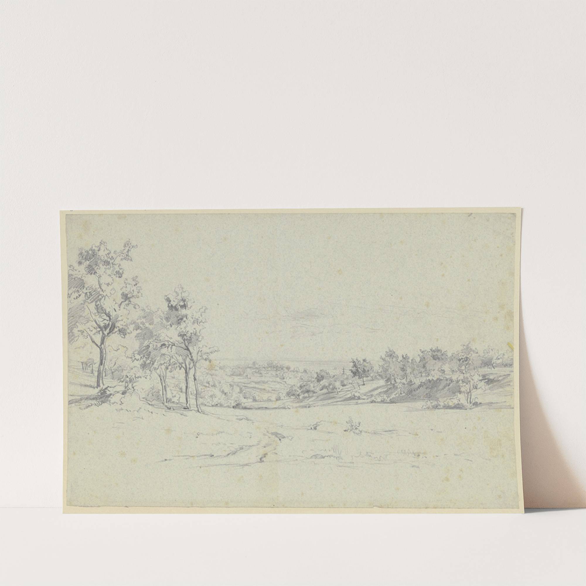 This serene landscape print captures the quiet beauty of nature with delicate pencil sketches. "Wiesenlandschaft mit Bäumen" by Adolf Höffler beautifully depicts a tranquil countryside scene. The artist's fine, precise lines create a subtle yet effective contrast against the white...