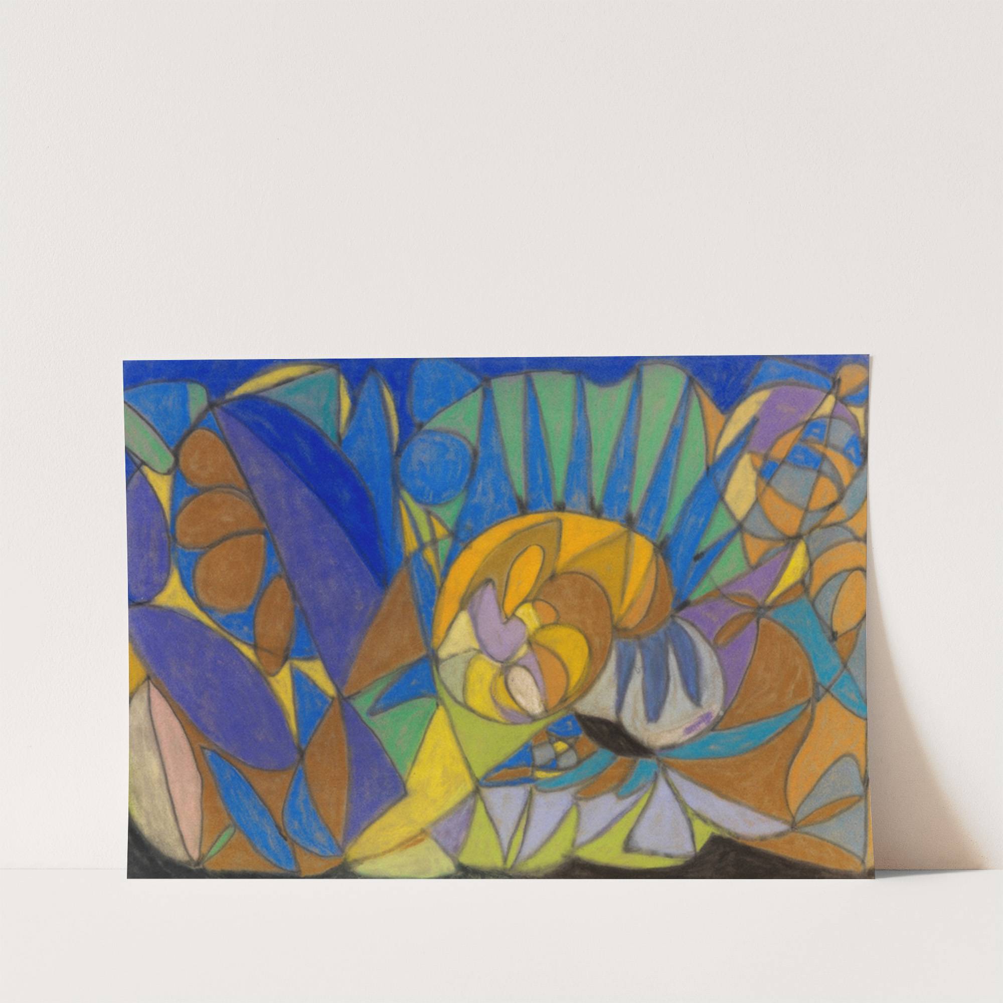 This vibrant abstract painting titled "Komposition" by Adolf Hölzel showcases an explosion of color and form, expertly woven into a dynamic visual tapestry. Dominated by deep blue hues, the canvas bursts with geometric shapes and organic curves, creating an energetic...