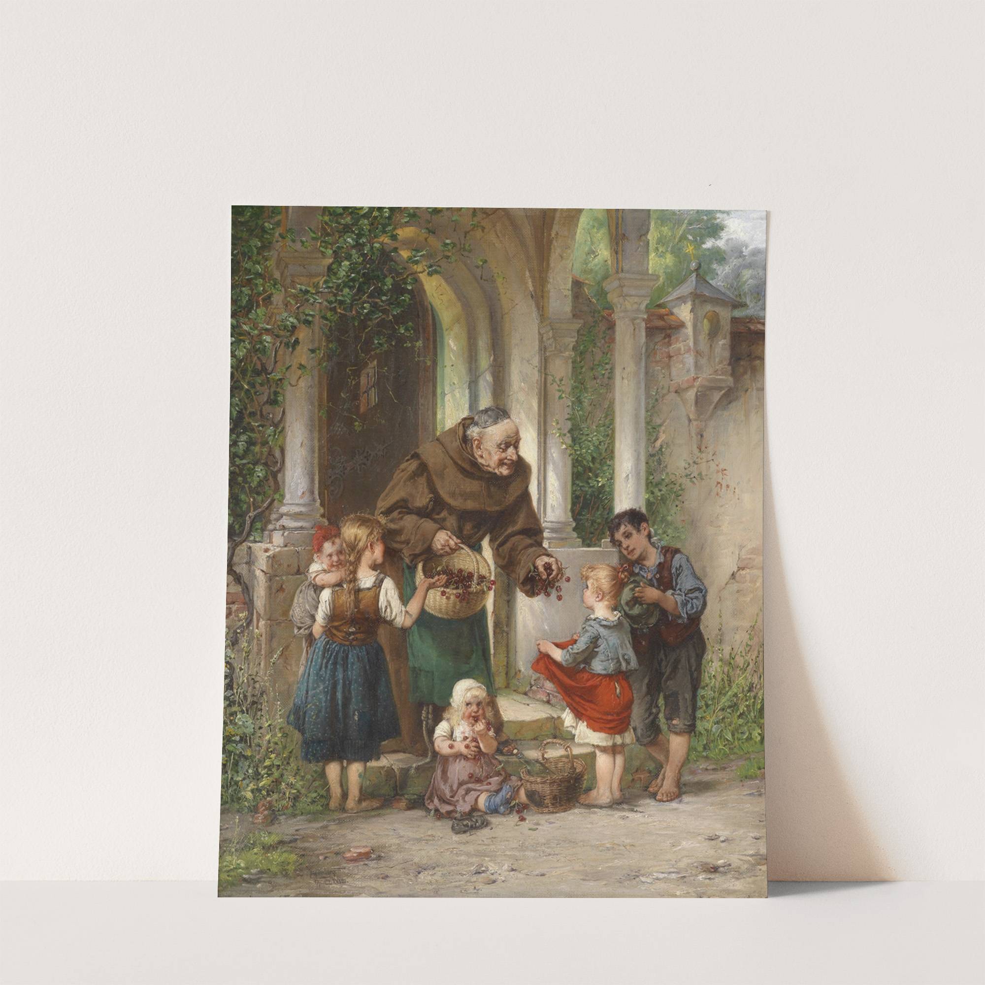 Introducing "Kirschen für die Kinder" by Adolf Humborg - a charmingly detailed and evocative painting that captures the timeless essence of rural life. This enchanting artwork features an elderly monk, clad in a brown robe with a hood, offering fresh...