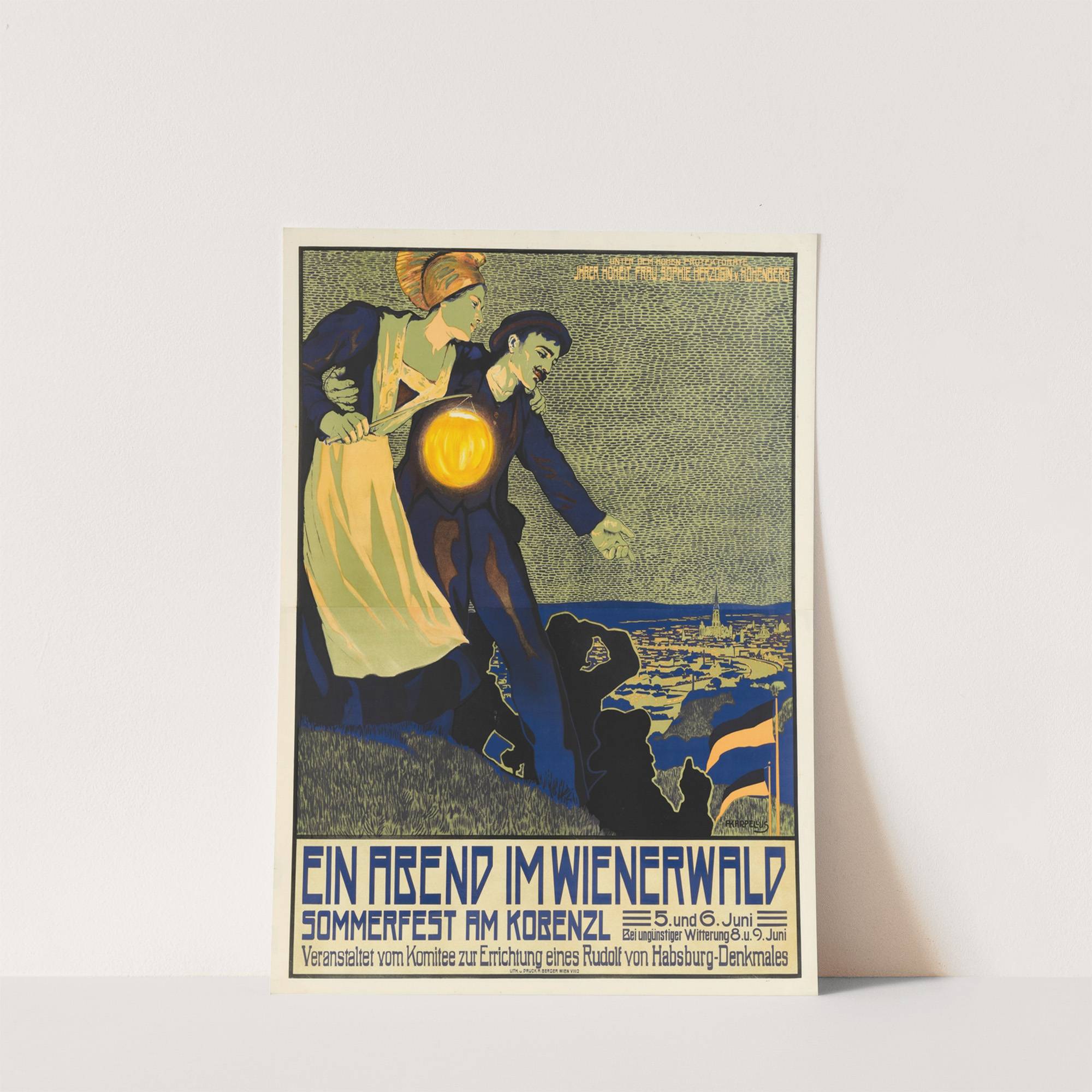 This vibrant art print showcases "Ein Abend im Wienerwald Sommerfest am Kobenzl" by Adolf Karpellus, a piece that captures the essence of early 20th-century poster art with its rich, detailed color palette and expressive style. The artwork features a couple...