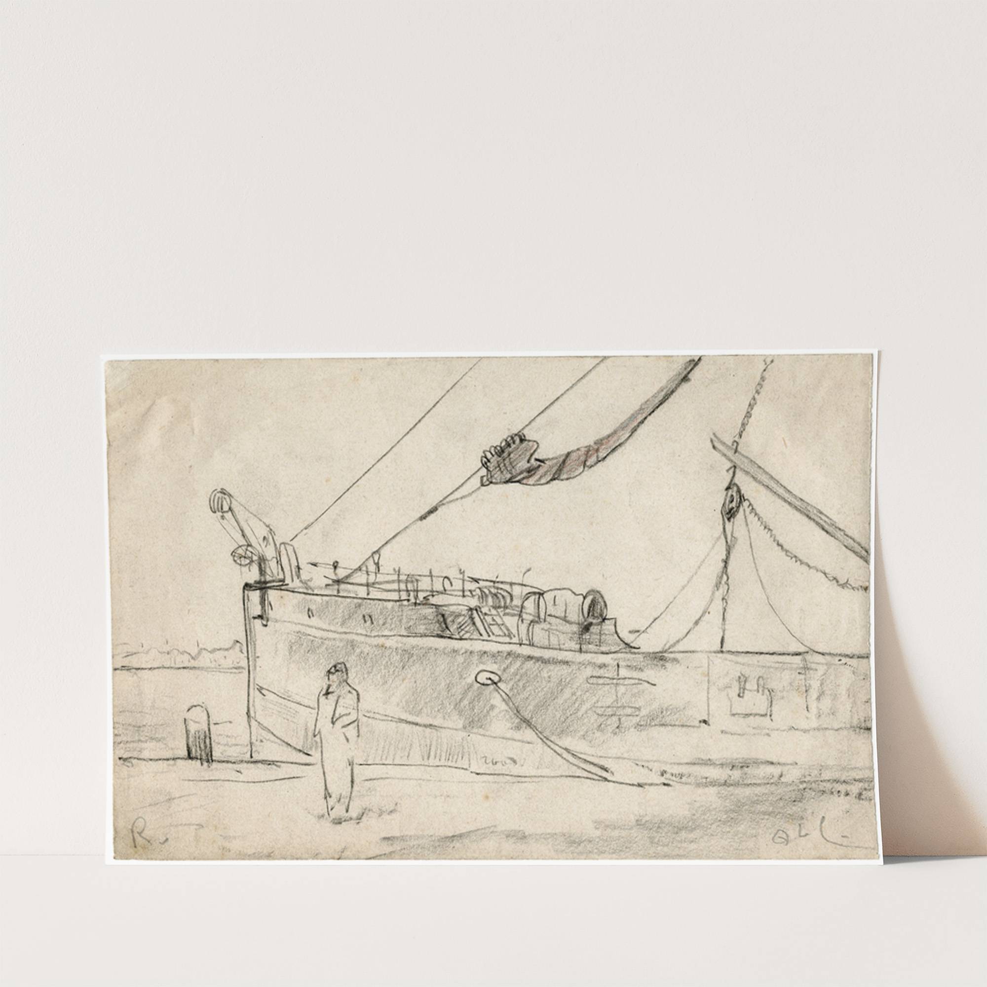 This black-and-white sketch captures a serene maritime scene with fine pencil details that bring out the textures and lines of the subject matter. A large seafaring vessel is docked on what appears to be a calm harbor, its sails partially...