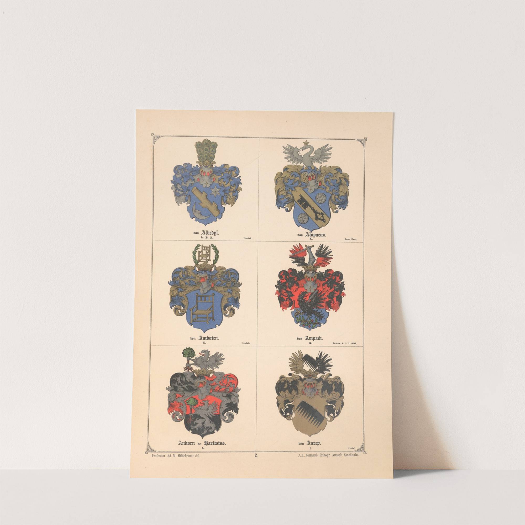 This art print showcases six distinct heraldic crests, each richly detailed with unique symbols and colors. Each crest is encircled in its own square grid, allowing for individual examination of their intricate designs.Top-left: A regal blue shield adorned with a...