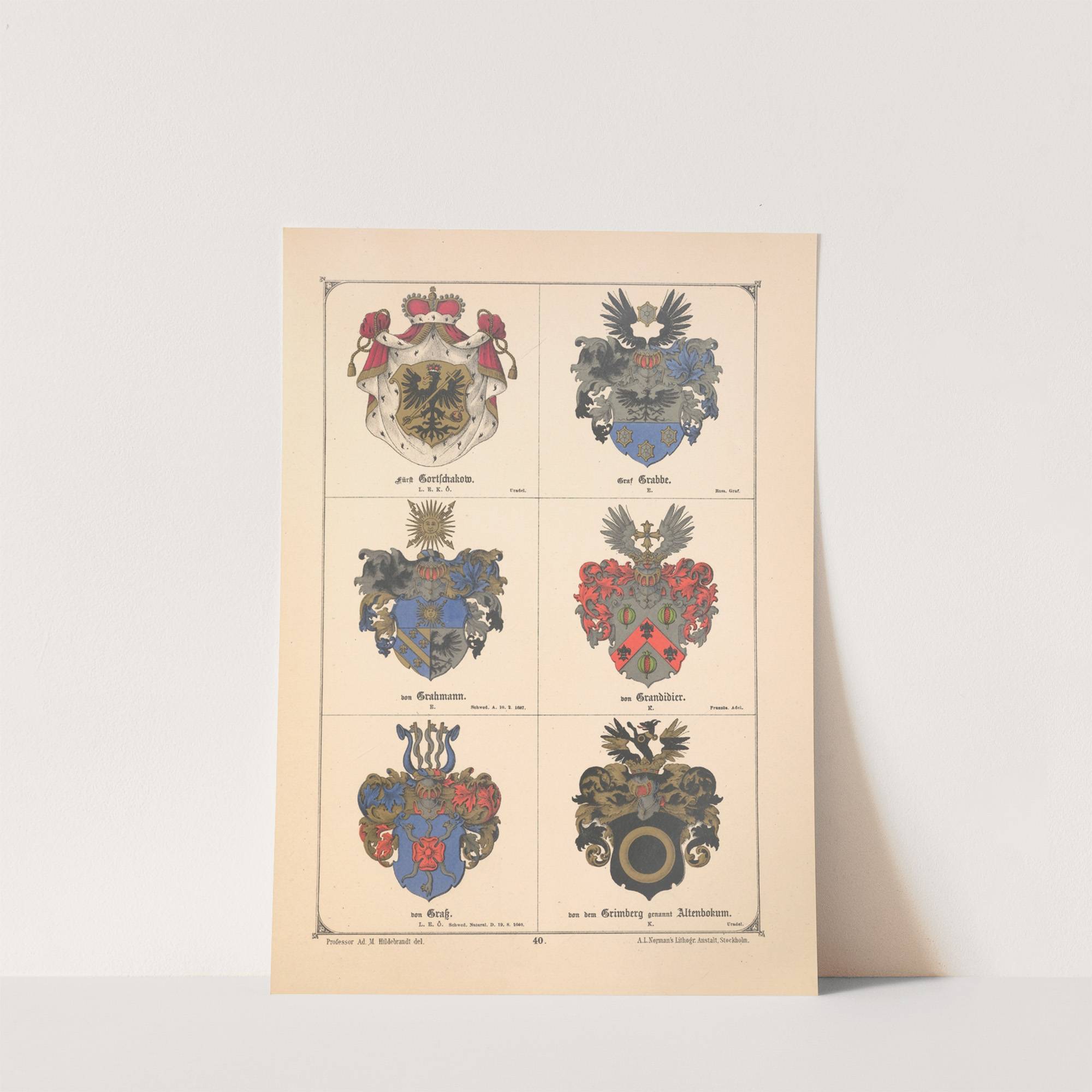 This beautifully illustrated print features six distinct coat of arms designs from "Baltische Wappenbuch Pl.034" by Adolf Matthias Hildebrandt, created in 1882. Each coat of arms is meticulously detailed and vibrantly colored, showcasing unique heraldic elements.The top-left image (1. Amt...
