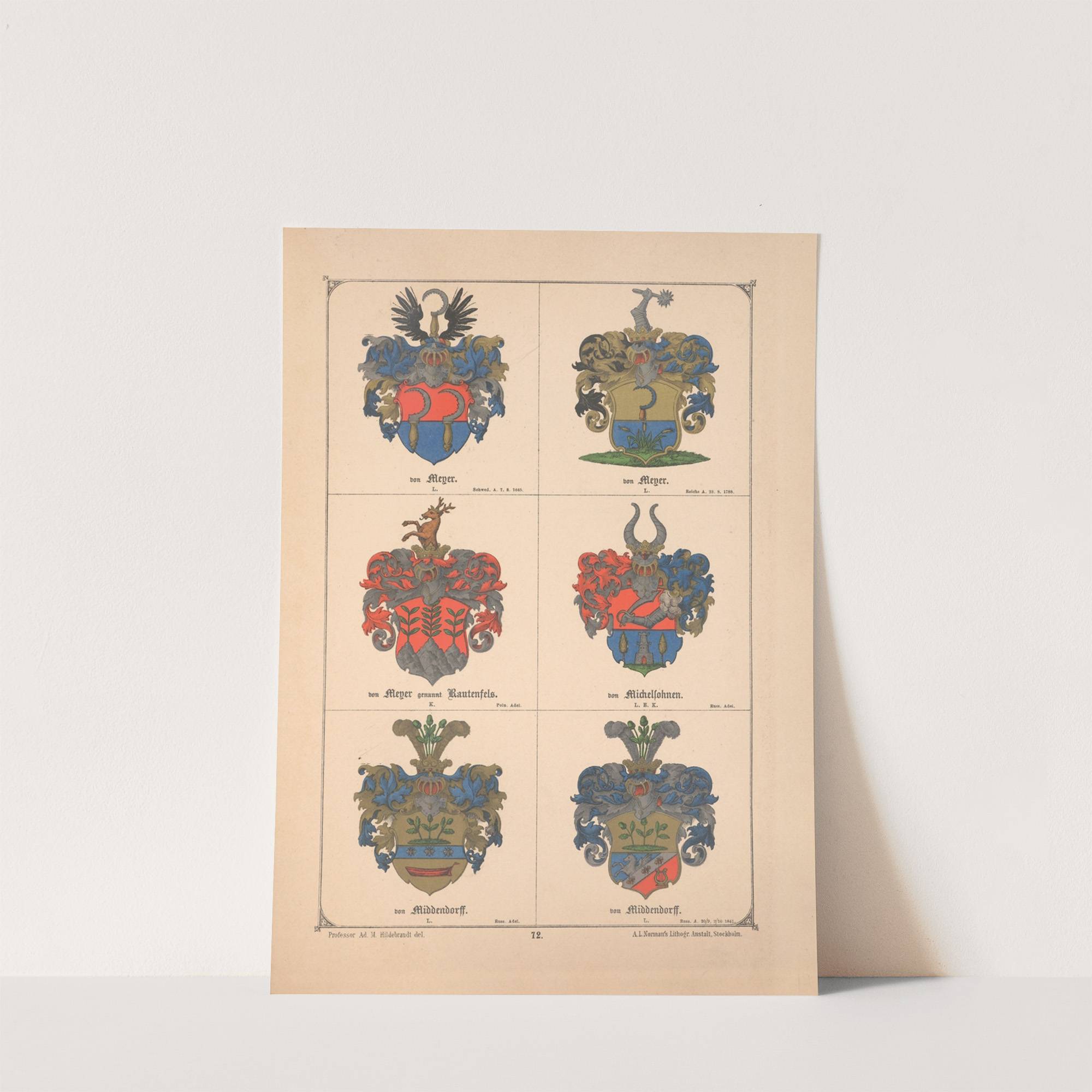 This print features six colorful heraldic coats of arms, each meticulously detailed in the style of traditional medieval German armor. The top two panels display two different crests: on the left, a bird with extended wings and a red heart...